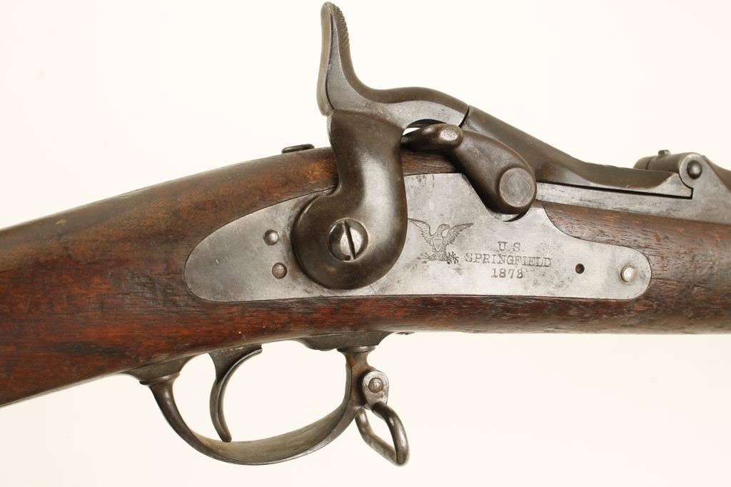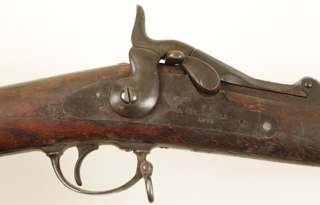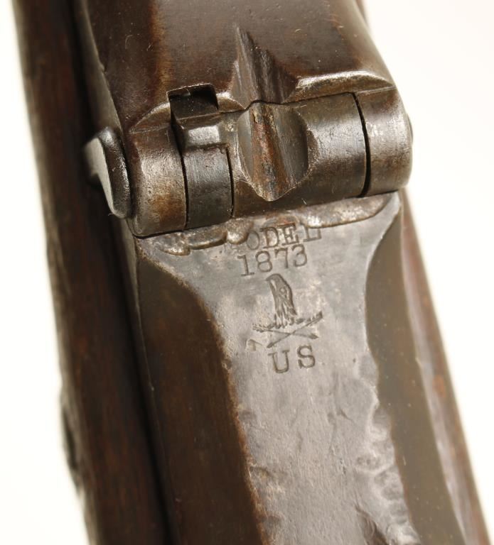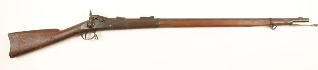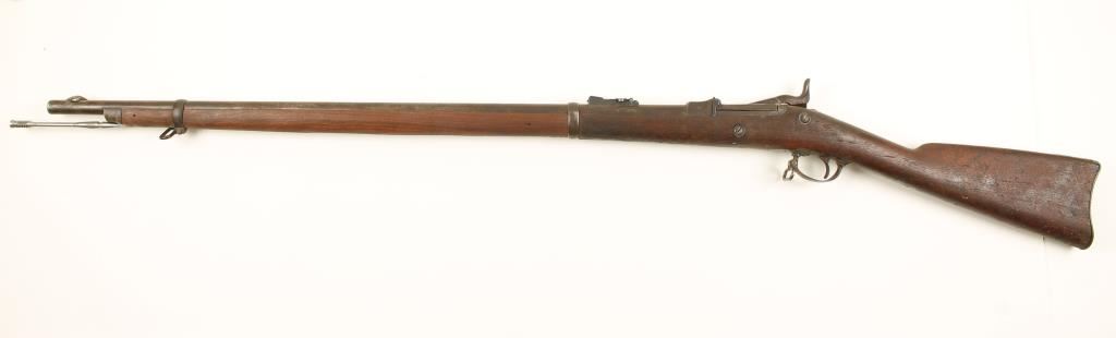 US military blued rifle with a 32-1/2" barrel. Metal finish is brown with areas of grey and areas of edge wear, surface rust and pitting. The breech block is battered. The stock is worn with scratches and dents and it appears to have shrunk down from the receiver, lock plate and butt plate. The forward part of the stock looks like a replacement. There is a cleaning rod that may not be correct. The bore is dark with little rifling. Action works well. Condition is poor. *Antique Firearm*