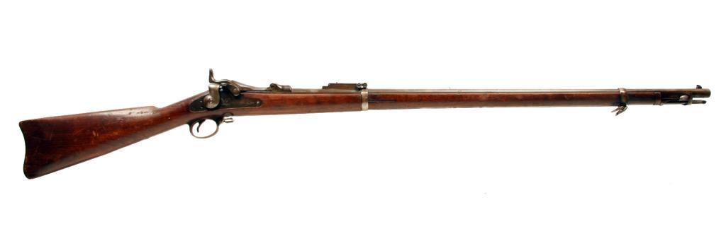Springfield Trapdoor Cal 45-70 SN:521294 rifle has scarce Ramrod bayonet, good overall, traces of blue, good markings, good wood, lock shows most blue and great markings, bore is very good, correct parts.