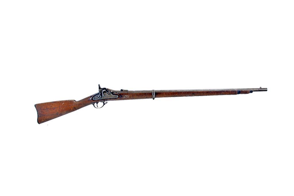 Springfield U.S.Model 1864 Cal .58 SN:6786 Civil war percussion musket converted to trap door in 1876. Barrel shows light brown patina, Hammer and trigger guard show faded blue, stock shows heavy use and is probably original to the gun as is the metaCivil war percussion musket converted to trap door in 1876. Barrel shows light brown patina, Hammer and trigger guard show faded blue, stock shows heavy use and is probably original to the gun as is the metal butt plate, missing two front barrelbands, rear sight, and cleaning rod. Condition: Not bad for a 150 year old gun, but could use a refinish/cleanup.