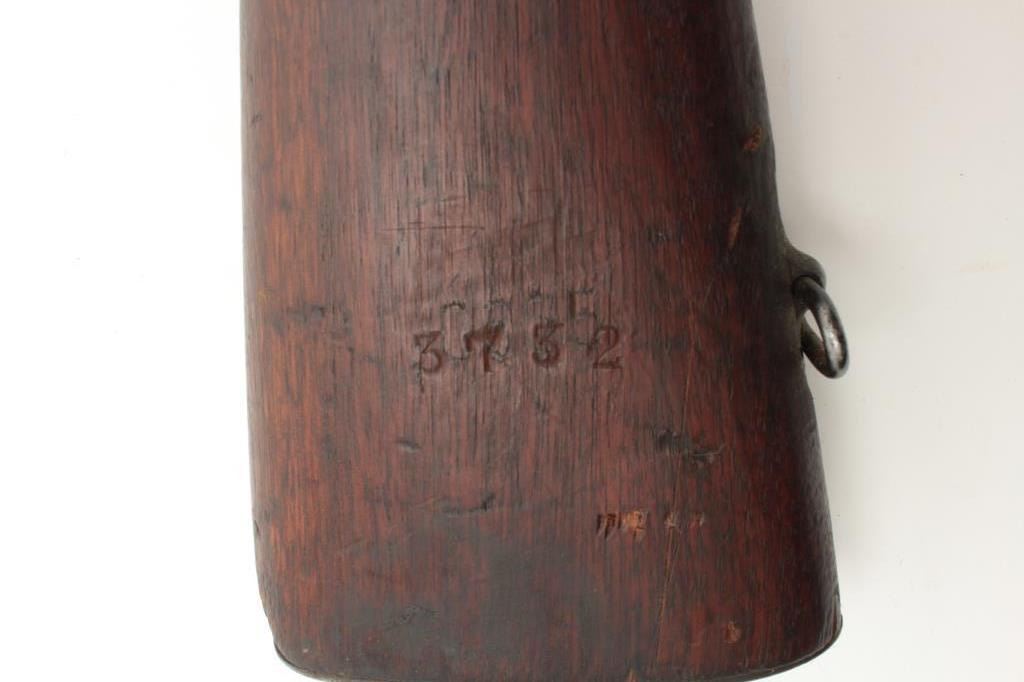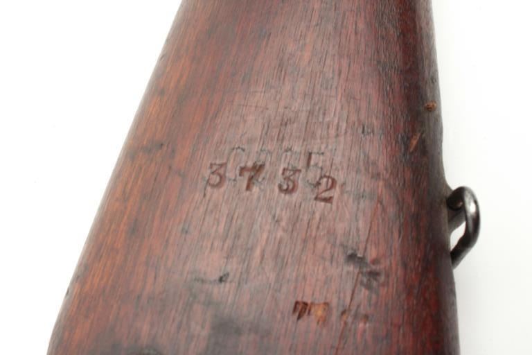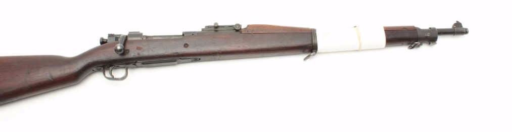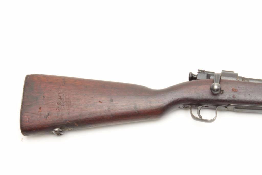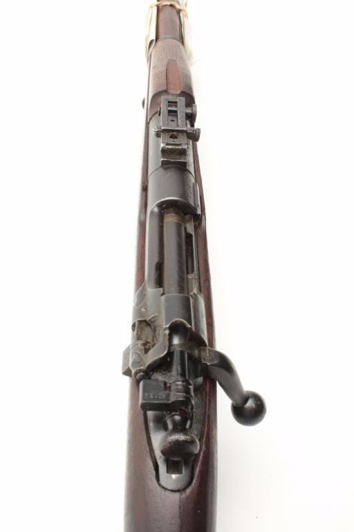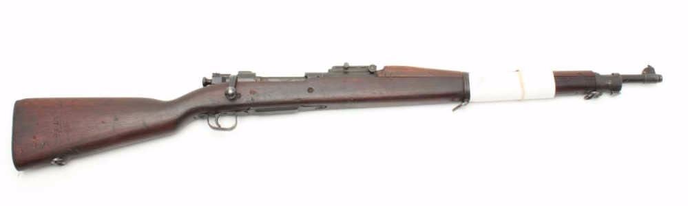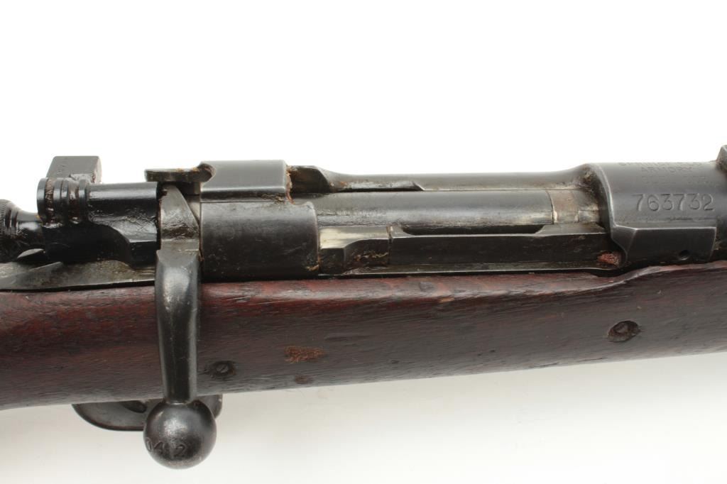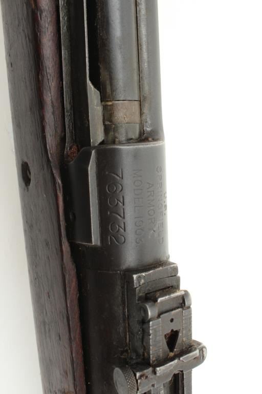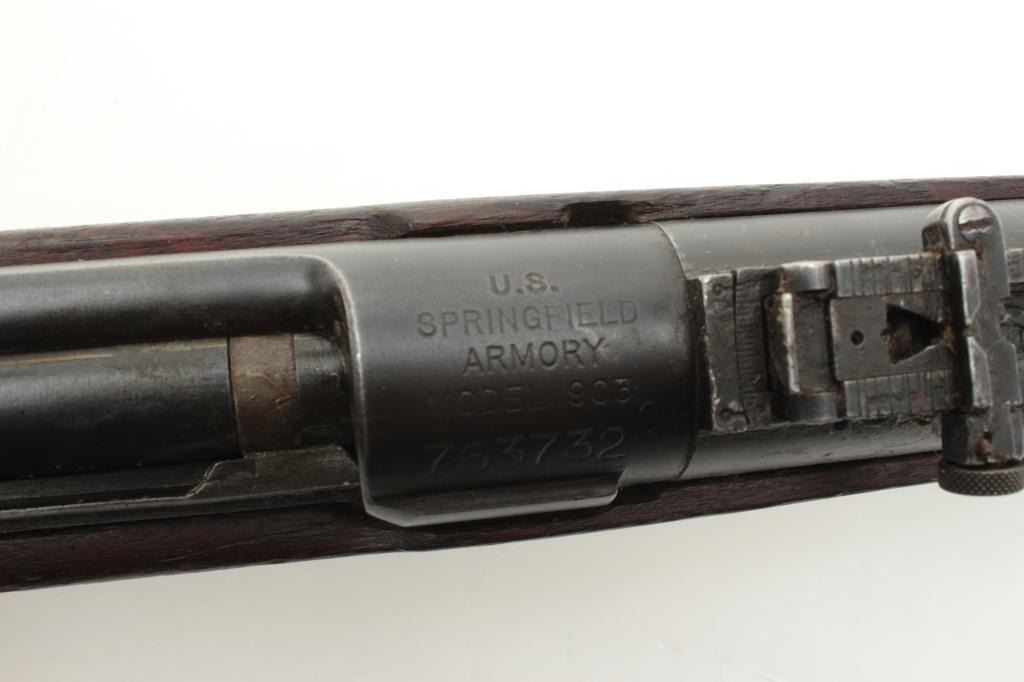 Springfield U.S. Model 1903 bolt action rifle, .30 caliber, serial #763372. The rifle is in good overall condition with a 24” barrel with a blade front and military ladder style rear sights. The barrel andreceiver retain the majority of their military finish with wear at the muzzle and dried grease evident. The barrel is Springfield marked and dated 9-42 with the flaming bomb emblem. The smooth wood stockshows moderate wear with numerous mars and compressions and is serialized to the action. The stock includes sling swivels and ends with a smooth metal butt plate. The bore is fair, the action is crisp and markings aresharp. The lot includes the CMP certificate of authenticity sent to the individual who ordered the rifle. (C+R) Est.: $400-$800
