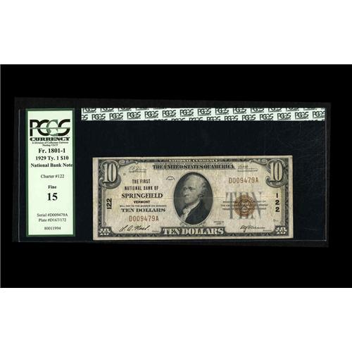 <B>Springfield, VT</B></I> - $10 1929 Ty. 1 <B>The First NB </B></I> Ch. # 122<BR>A nicely margined <B>PCGS Fine 15</B></I> with a certified grade no one could quibble over.
