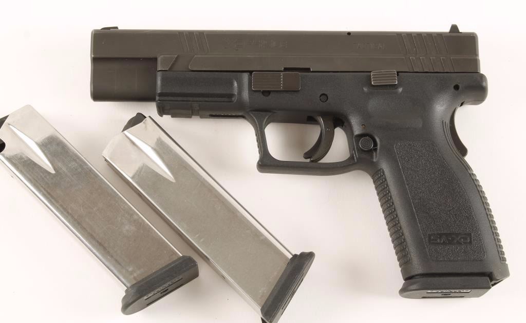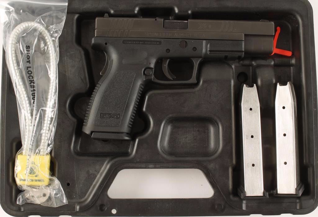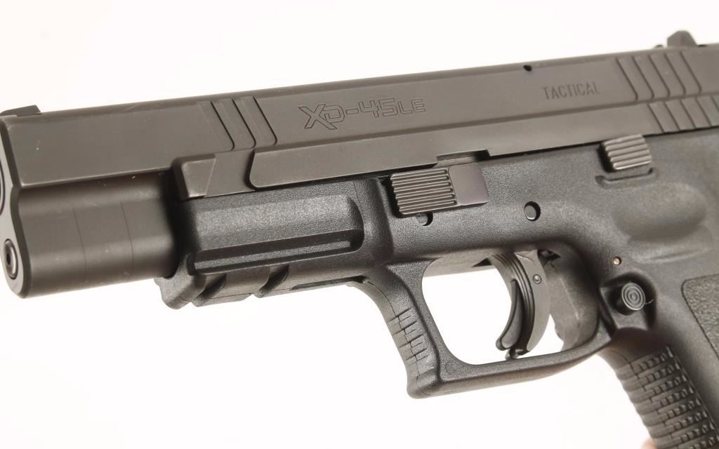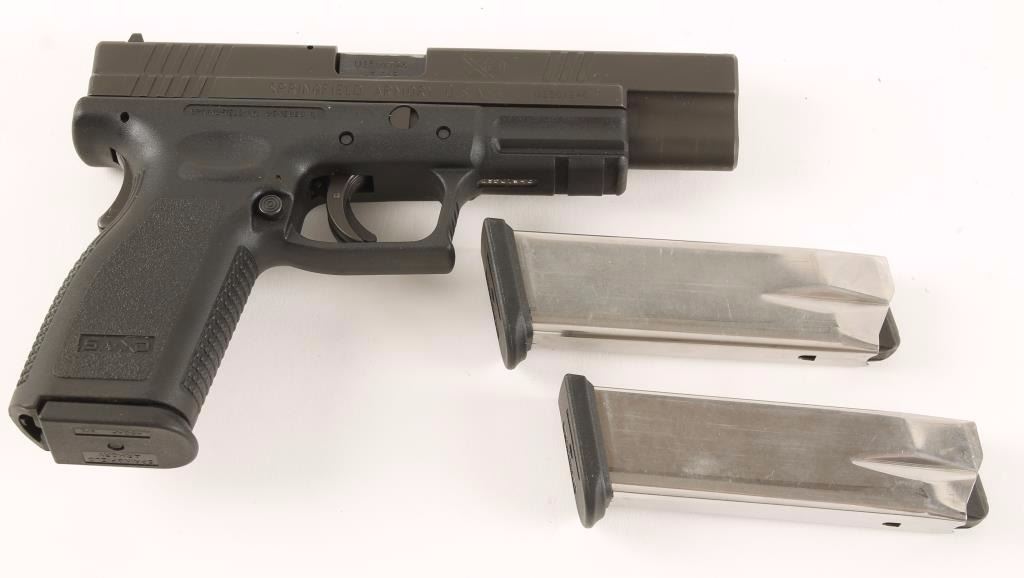 Single action semi-automatic tactical pistol chambered in .45 Glock Automatic Pistol. Features a 5" barrel, three dot sights, matte blued serrated slide, ambidextrous magazine release, nine round magazine, grip safety, trigger safety and black polymer frame with picatinney rail, ambidextrous thumb rest and stippled grip frame. Includes original factory case, lock, brush, documents and two extra magazines. Finish shows wear to top of chamber/barrel and slight edge wear near muzzle but is otherwise flawless. Bore is excellent, and action is very good. Condition is near excellent. ***Modern Firearm***