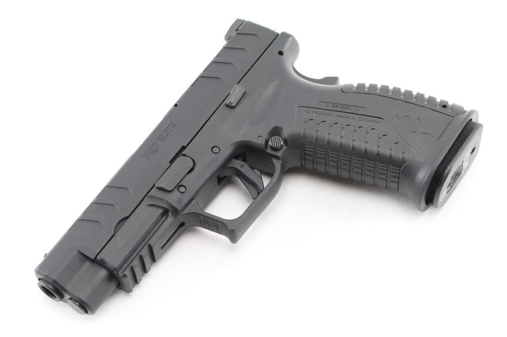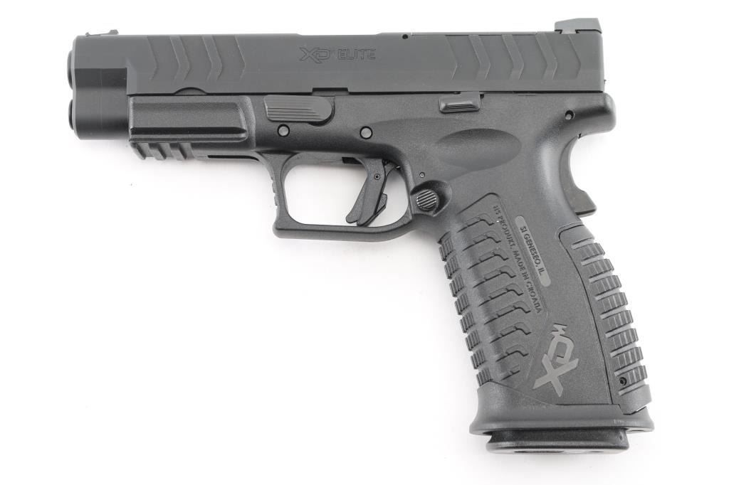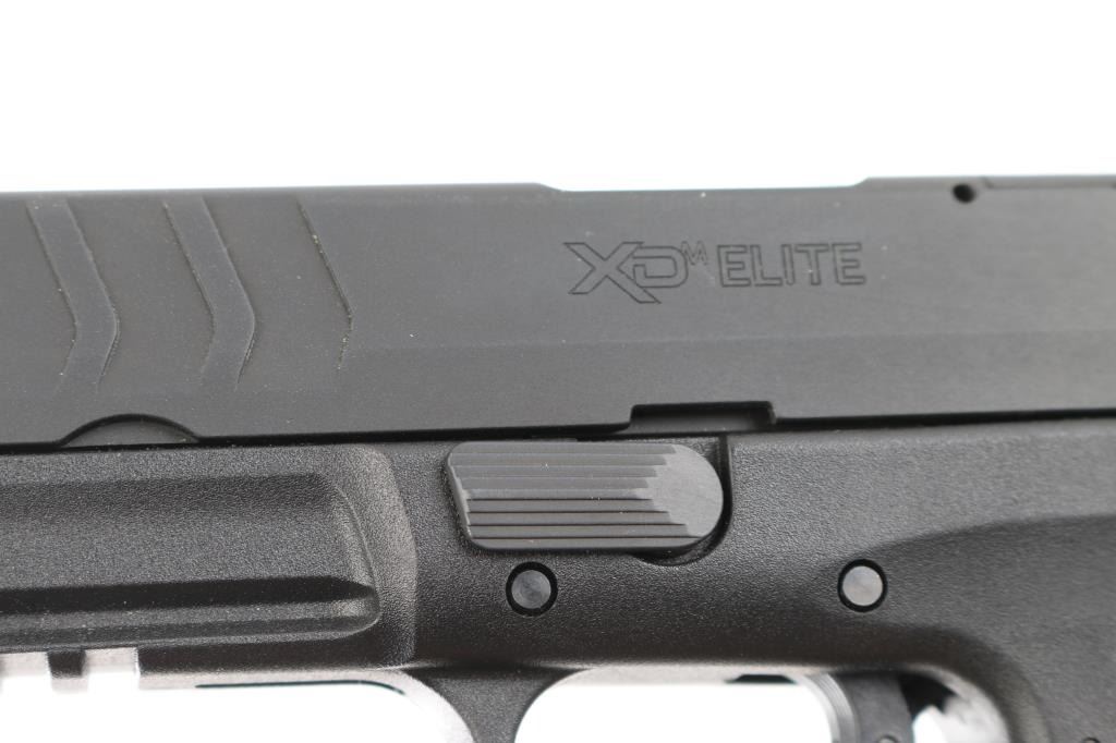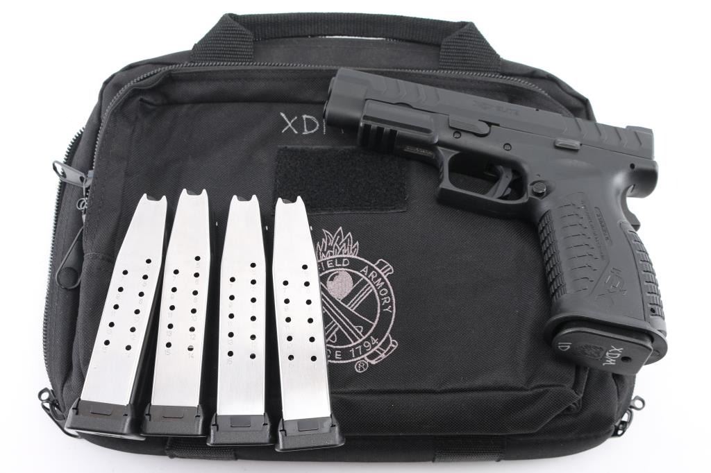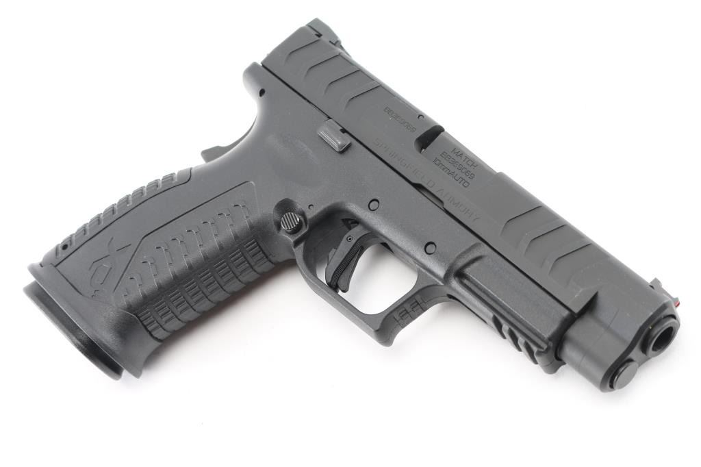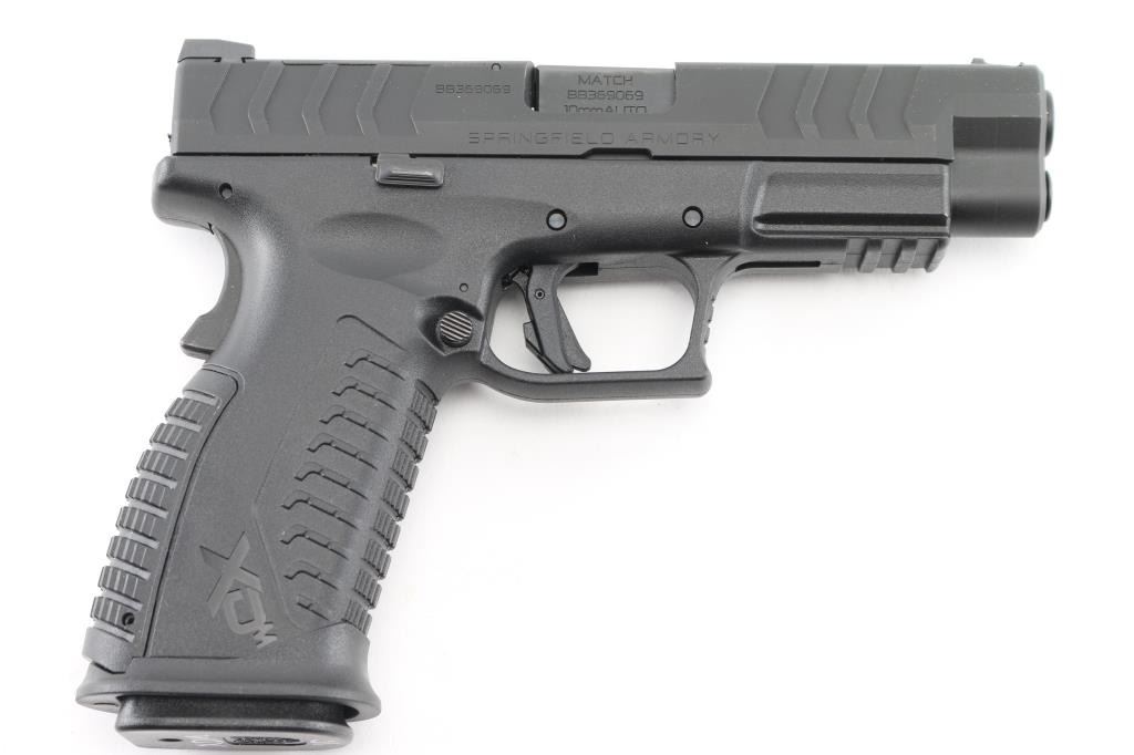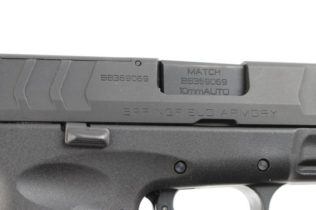 Full size striker fired semi-automatic pistol chambered in 10mm Auto, manufactured in Croatia by HS Produkt and imported/marketed by Springfield Inc. of Geneseo, IL. Features a matte black Melonite finished slide with fore & aft cocking serrations, 4.5" barrel (marked "MATCH"), full-length steel guide rod, dovetailed three-dot steel sights with fiber-optic front & "U" shaped rear, loaded chamber indicator on the top of the slide, cocked indicator on the rear of the slide, integral trigger safety, grip safety, ambidextrous push button magazine release, ambi slide stop, OEM 15 round magazines, and black polymer frame with integral accessory rail, textured grip with ambidextrous thumb rest grip and interchangeable backstrap, flared magazine well. Top of slide has removable panel to allow optic mounting. Overall like new condition, few handling marks. Action is sound, the bore is pristine and the polymer is excellent. Includes manual, factory black nylon carry bag with magazine compartments, additional backstraps, five mags. Bag & mags marked "XDM 10mm" in silver pen. Condition is NRA Excellent - like new *** Modern Firearm ***