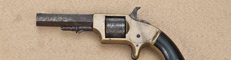 Springfield arms company marked .30 caliber single action brass frame revolver from Civil War era, serial #4975. The revolver remains in fair to good original condition with brown patina finish on barrel and cylinder, some light to fairly heavy pitting and erosion. The frame shows a dark honey patina, the grips are fair to good with even wear and going dark from oiling. The action is good, the barrel address is good, original cylinder pin and small springs retained. Est: $200 - $400
