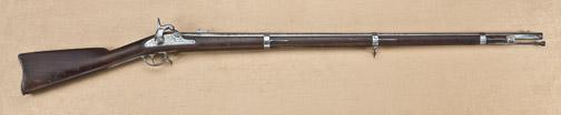 Springfield model 1861 .58 caliber rifled musket with desirable 1861 lock date, refer Flayderman 9A-313. The rifle shows a grey patina finish with scattered light to moderate erosion and pinprick pitting. Some slightly heavier pitting at the face of the hammer, bolster, and rear 3” of breech from firing and use. The edges are good, the markings are fairly crisp, the stock is good and shows some light cleaning with steel wool but no sanding. No evidence of cartouche. The wood to metal fit is good, the correct bands, rear sight, small parts are all retained. The action is good, The bore is somewhat dark and shows considerable use and may clean- fair only. Est: $2,500 - $3,500