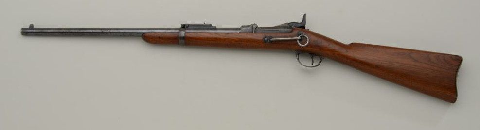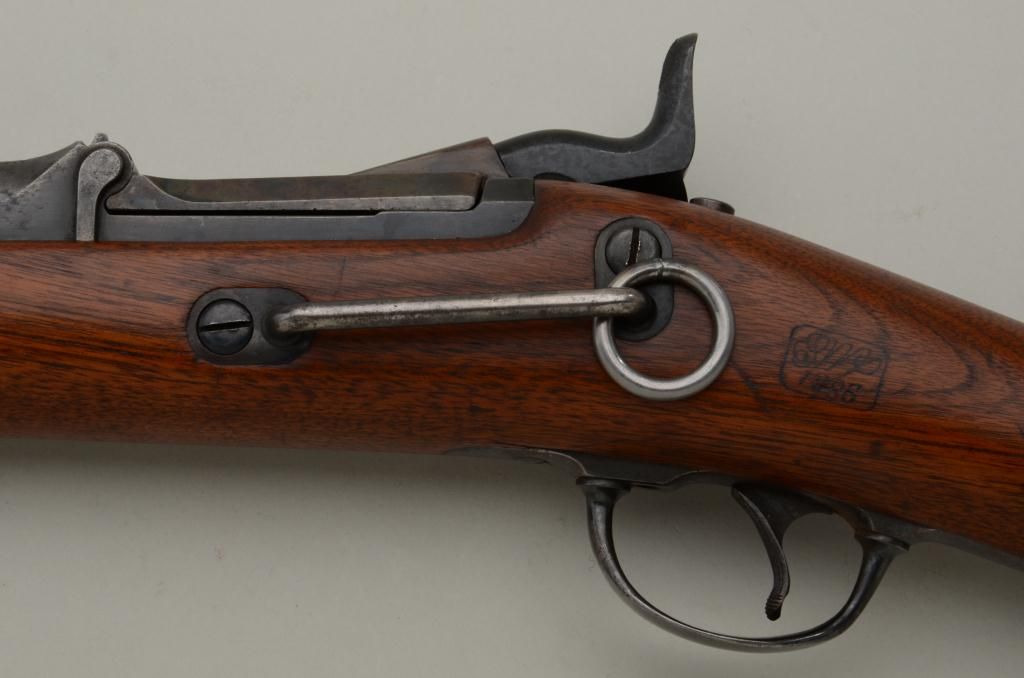 Springfield model 1884 carbine .45-.70 caliber serial number 34103X (last number not legible) in very good plus original condition showing considerable original blue and case hardened finish. The barrel shows50% to 70% original bright blue with some losses on the edges and areas where the finish is lost are going to a patina with some scattered erosion, slight scratches and minor pitting. The lock shows 50% to 70%dulling original blue, the trigger guard shows 50% to 70% bright blue that is drifting, the butt plate shows 50% to 70% toning blue finish. The breech block shows 1873 date and approximately 75% to 85%original bright case hardened colors. The stock is in near fine condition with sharp S.V. W 1886 cartouche and the stock shows just some minor small marks and handling with good P proof just behind the trigger guard. The original small parts are retained and the Buffington type rear sight shows the letter C. The action is tight and the bore is very good plus and may clean to fine. The compartment in the butt shows shell