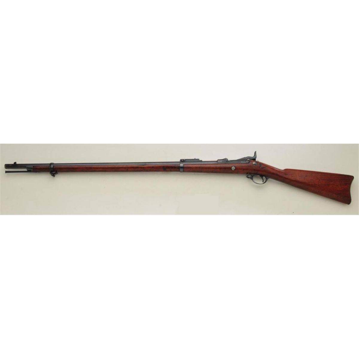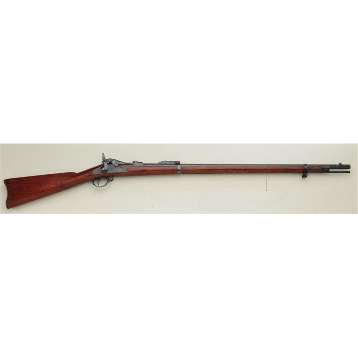 Springfield model 1884 trapdoor rifle, .45-70 caliber, serial #309097. The rifle shows Buffington type rear sight and remains in very good condition showing 75-85% original toning blue finish. The markings are sharp,edges fairly crisp, some light beginning erosion. The stock is good with some dings, mars, scratches, a couple of gouges, and no visible inspector’s marks or cartouche. An original cleaning rod is retained. The boreis bright and at least very good. Est: $700 - $1,400