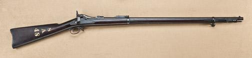 Springfield model 1889 ramrod bayonet model trapdoor rifle serial #516751, Refer Flayderman 9A-387. The rifle remains in original very good condition showing 60-80% original blue starting to drift and age naturally with some light erosion and pinprick pitting and drifting to a brown patina. Breech block shows traces of case hardening, markings are sharp. Stocks are very good plus showing a good 1891 cartouche, “P” proof behind trigger guard, and just a couple of dents behind cleaning rod channel, no losses. The stock is painted with arsenal type numbers “8A” over “48”. The markings are sharp, the action is good, the bore is excellent. From the Bernard Braverman collection. Est: $750 - $1,500
