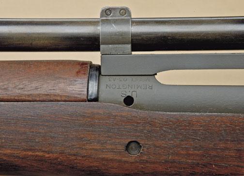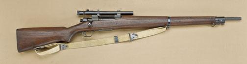 Springfield model 1903A4 sniper rifle by Remington, serial #3426057 with offset serial number for scope and milled bolt handle for scope clearance. Barrel dated 9/43 and Remington marked. Made without front sight.Correct Redfield type mount with M73B1 scope. Refer: The Springfield Rifles by Brophy, pages 187-190. The rifle shows C-type stock with oil finish, stock is cartouched “FJA” and “RA” above trigger with ordinance wheel.The rifle is in near fine condition with most of its arsenal parkerized finish. 90% plus blue on bolt bands, stock near excellent with a couple of minor storage marks and bruises, crisp ultra-sharp cartouches, showing justslight handling and minimal use. The action is tight, bore excellent, optics clear. A 9.6-9.8 on 1-10 scale. Shows fabric sling, probably from Thompson. Est: $2,000 - $4,000
