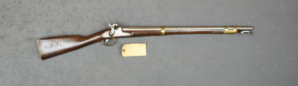 Springfield percussion SRC, .69 cal., 26” barrel, bright finish, full wood stock with brass barrel bands, lock plate is dated 1853 and barrel dated 1851. This gun is in overall very good condition showing an even brightfinish to metal surfaces, good bore, markings and crisp action, brass trigger guard and butt plate, lengthy saddle ring bar on left side of stock; V, P and eagle head proofs on barrel at breech; right side of butt stockshows carved initials “J. P. F.”. Hard-to-find in any condition and this is a nice one. Est.: $2,000-$4,000.