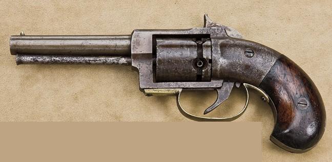 Springfield percussion pocket revolver, .36 cal., 3-3/4” barrel, wood birds head grips, #NVSN. This gun is in overall fair condition with a medium to dark brown patina over scattered areas of moderate pitting on the frame and cylinder; barrel assembly appears heavily cleaned as has the cylinder pin; action needs repair, brass trigger guard is present, grips are overall good; hammer and trigger appear to have been period repaired. Est.: $500-$1,000.