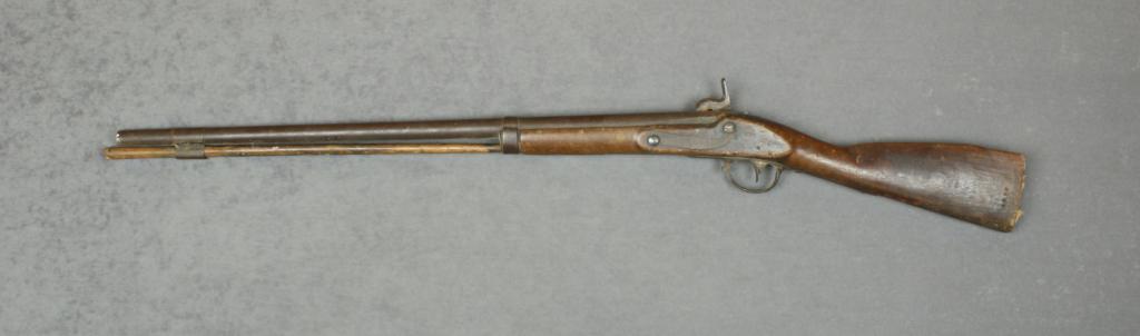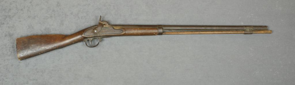 Springfield rifle converted to percussion and  period modified to fowler-style, .70 cal.,  30” barrel, heavy patina on metal surfaces,  lock plate dated 1825, break to trigger  guard, wood is dry with scattered wear, nicks and mars; “OHIO” marked at top of wrist  behind the top tang; classic relic condition  with oak ramrod and functioning action.   Est.:  $350-$700.