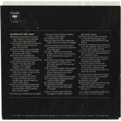 <B>Bruce Springsteen <I>Blinded By The Light</B></I> 45 Picture Sleeve (Columbia 45805, 1973).</B></I> By far the Boss' rarest picture sleeve, and this one's a super copy. The record is not included. The sleeve has a 1" area of surface wear just to the left of Bruce's head where very light pencil writing has been erased. There's also some mild wrinkling; otherwise, the condition is EX 7.<BR><BR><b>Shipping:</b> Other (oversized items, group lo (<a target="_blank" href="http://www.heritageauctions.com/common/shipping.php">view shipping information</a>)