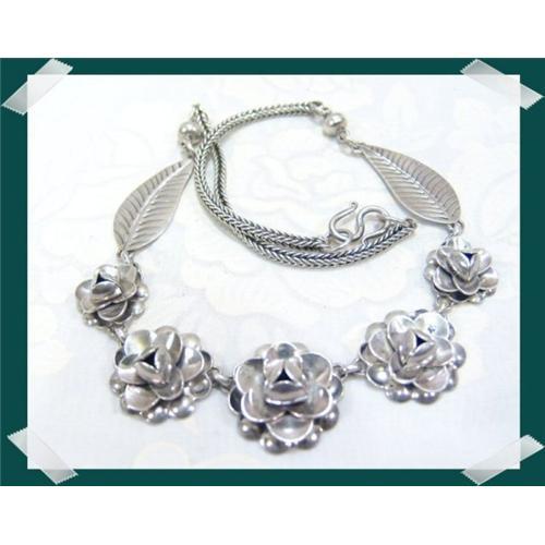 The flower buds are graduated in size with the center having a diameter of 25mm or 1". The exquisitely designed leaves measure 35mm in length. The necklace has an overall length of 18".