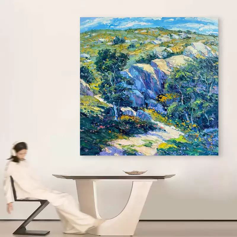 Set under a bright blue sky, layered rocks, green trees, and scattered wildflowers shape a fresh spring mountain scene. The bold yet lively brushstrokes make the hills seem to ripple in the sunlight, brimming with vitality and a sense of freedom. Dimensions: 24 x 24 inches.