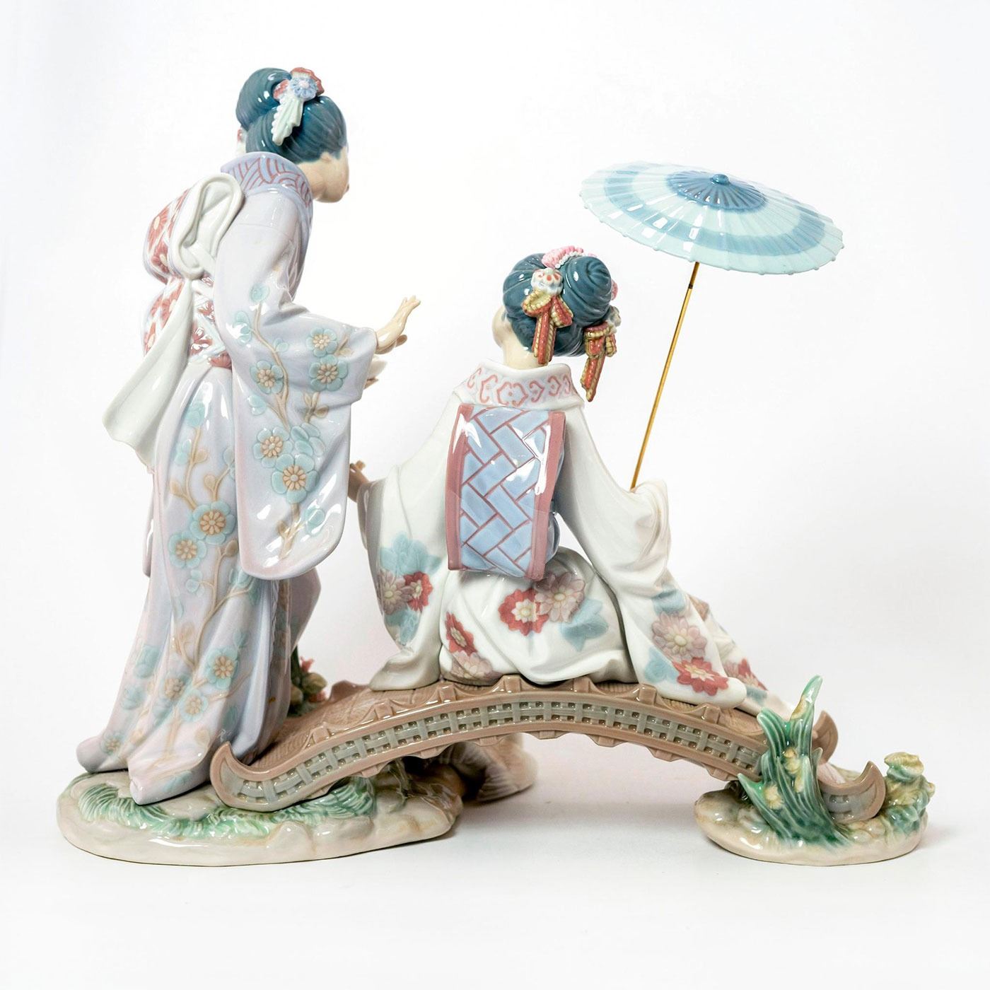 Glossy large porcelain; modeled as Geisha's on a bridge.