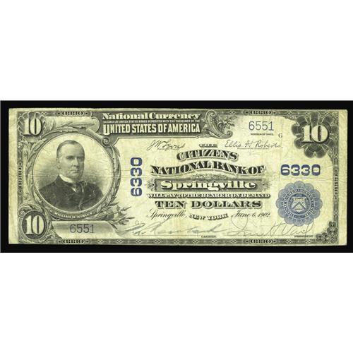 <B>Springville, NY</B></I> - $10 1902 Plain Back Fr. 624 <B>The Citizens NB</B></I> Ch. # 6330<BR>A tougher Buffalo area bank in large, with fewer than ten examples listed in the new census. <B>Fine.</B></I>