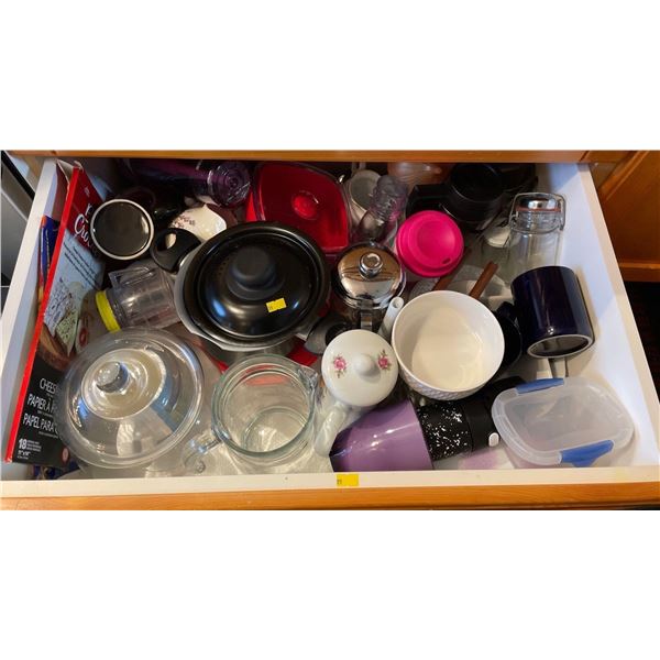 Contents Of Drawer - Pyrex, Glassware, Pots, Travel Mugs, & More