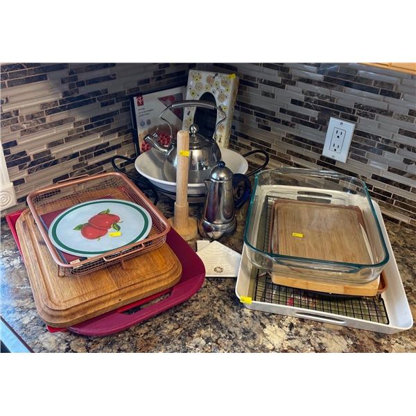 Assorted Lot Of Kitchen & Home Decor - Pyrex, Wooden Cutting Boards, Serving Trays & More
