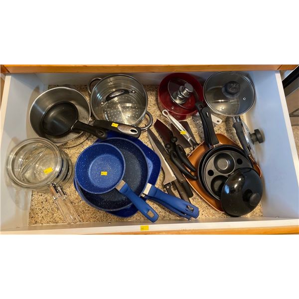 Entire Contents Of Drawer - Non Stick Frying Pans, Pots, Knife Set & More