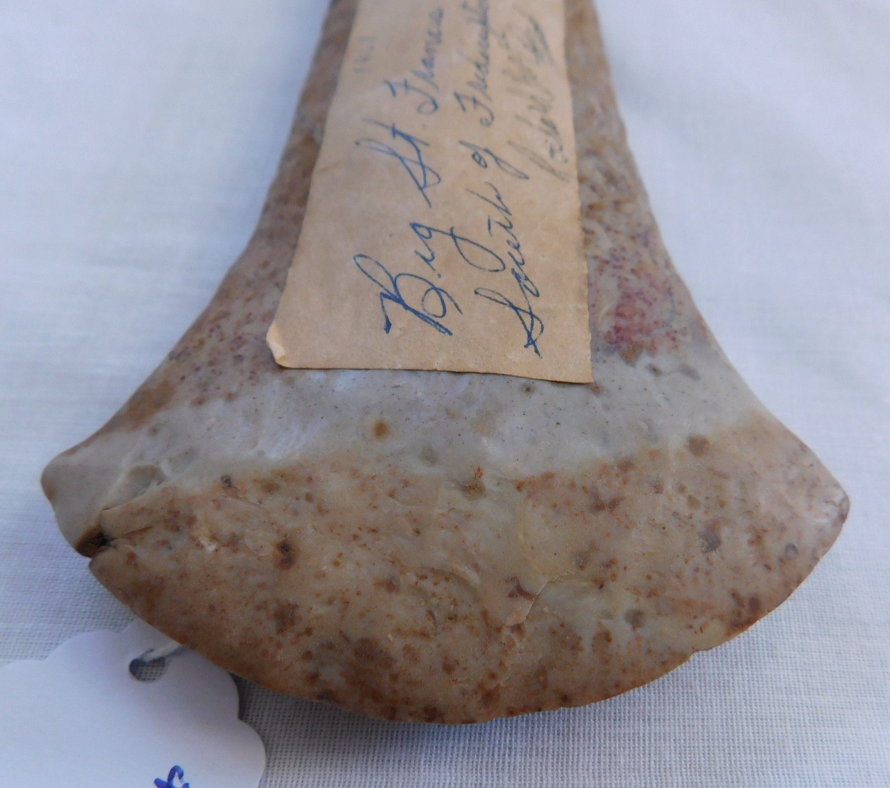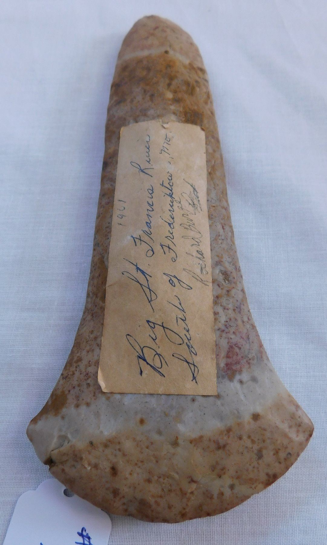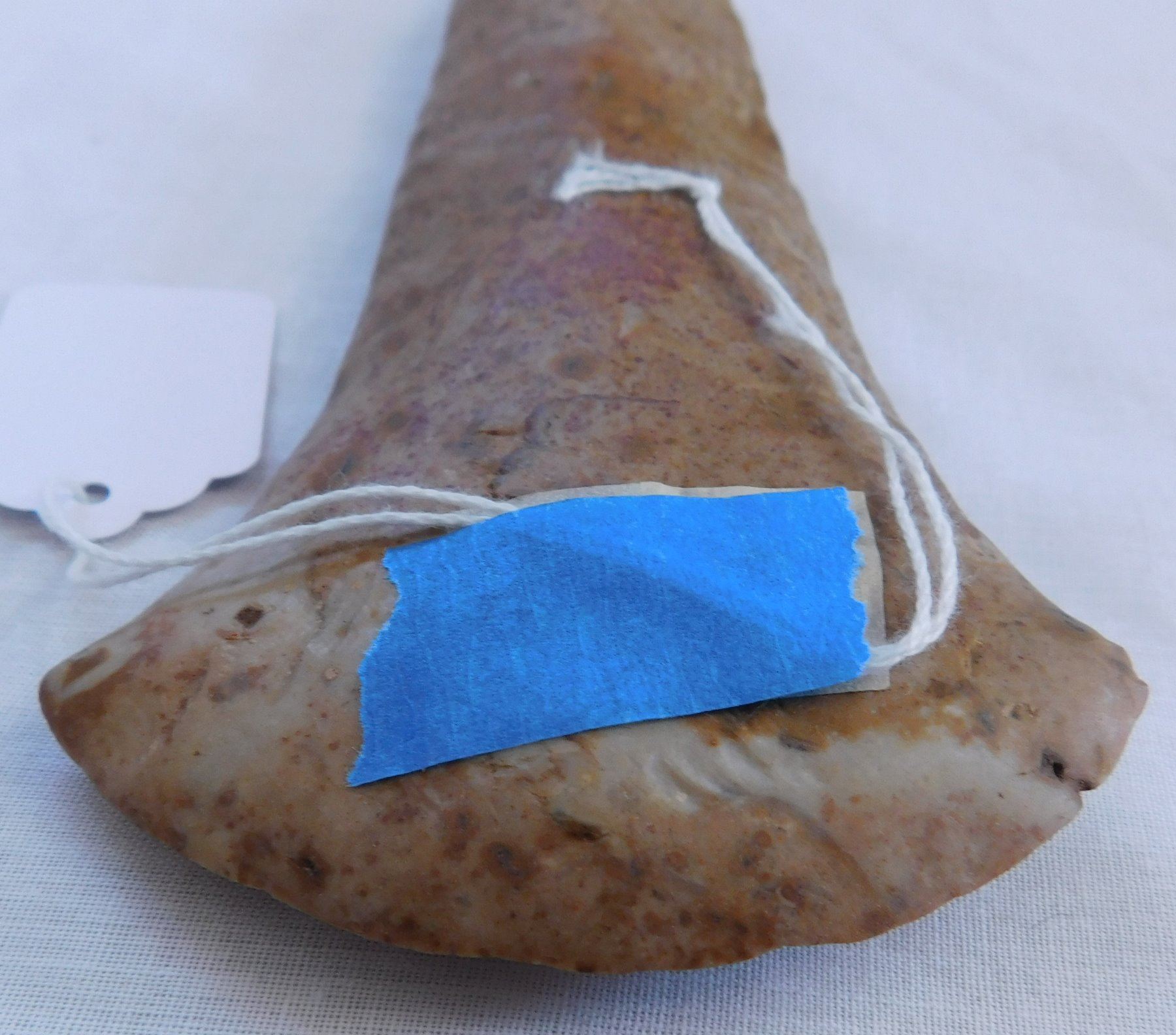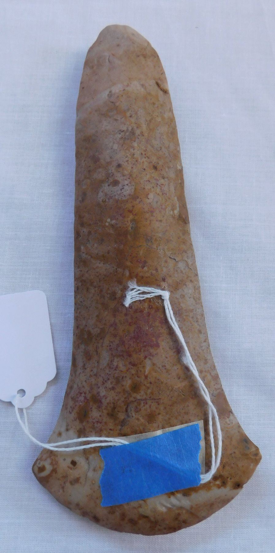 Spud Stone, pre-historic item. Made of stone, the item measures 8 1/8" x 3 1/4". Frederickstown, Missouri. Condition: As found, see images. Shipping: $25.50 w/insurance and signature, due to value.