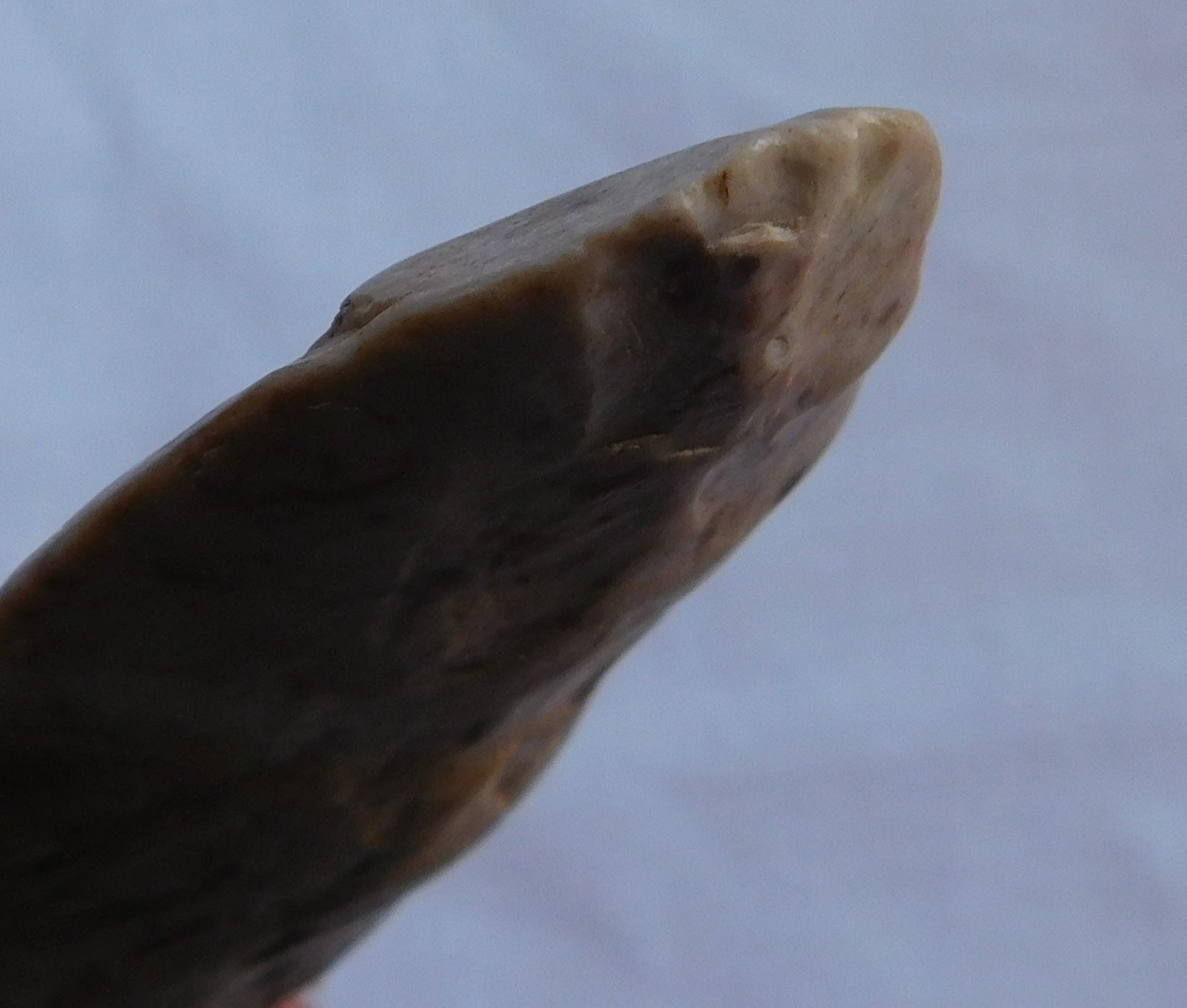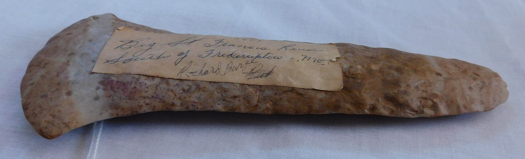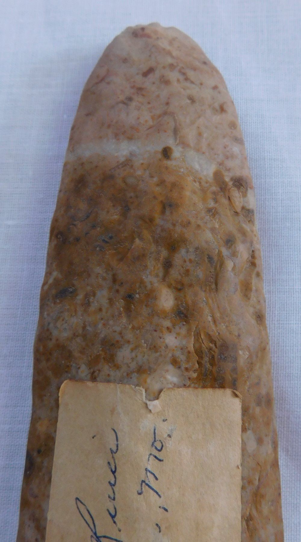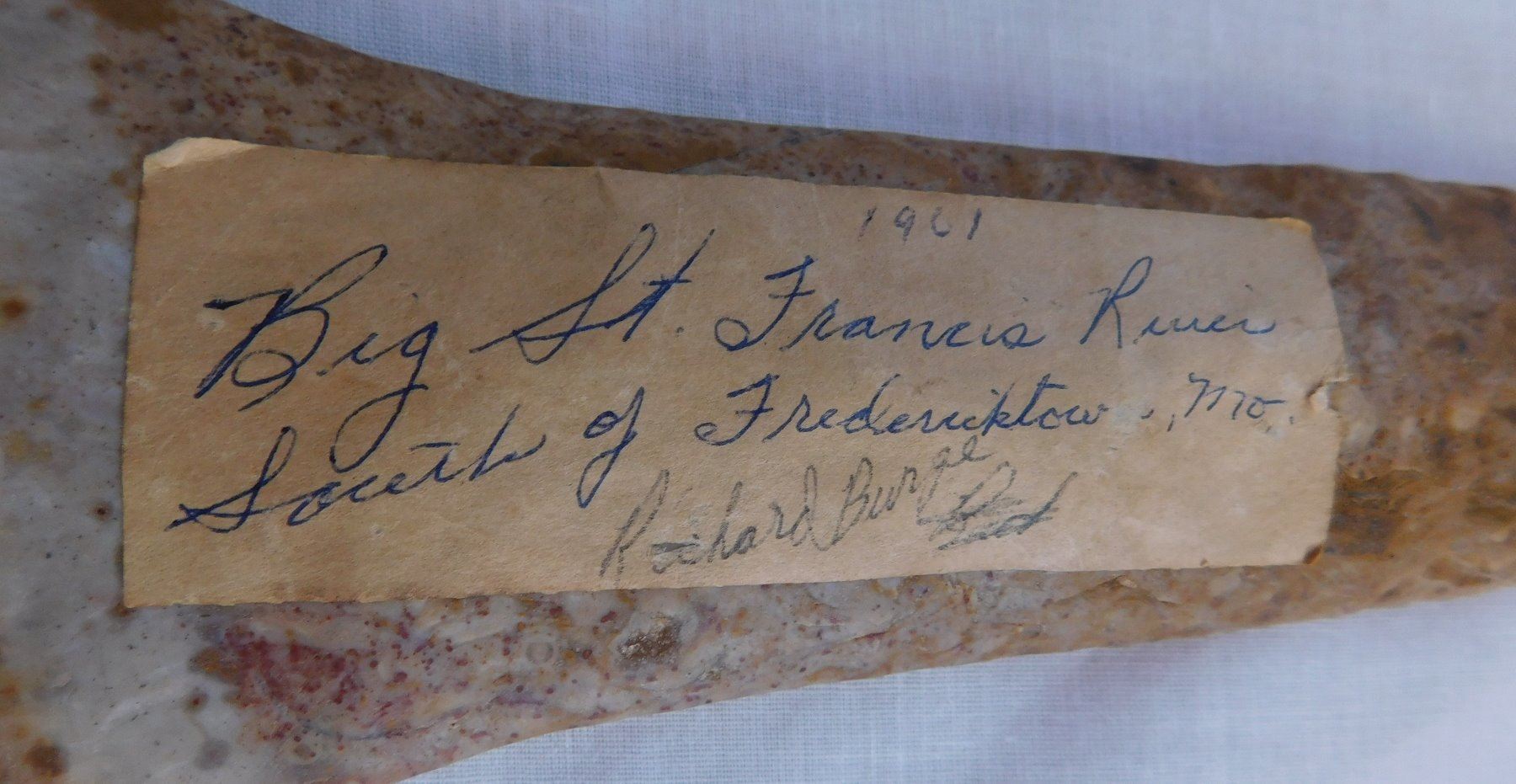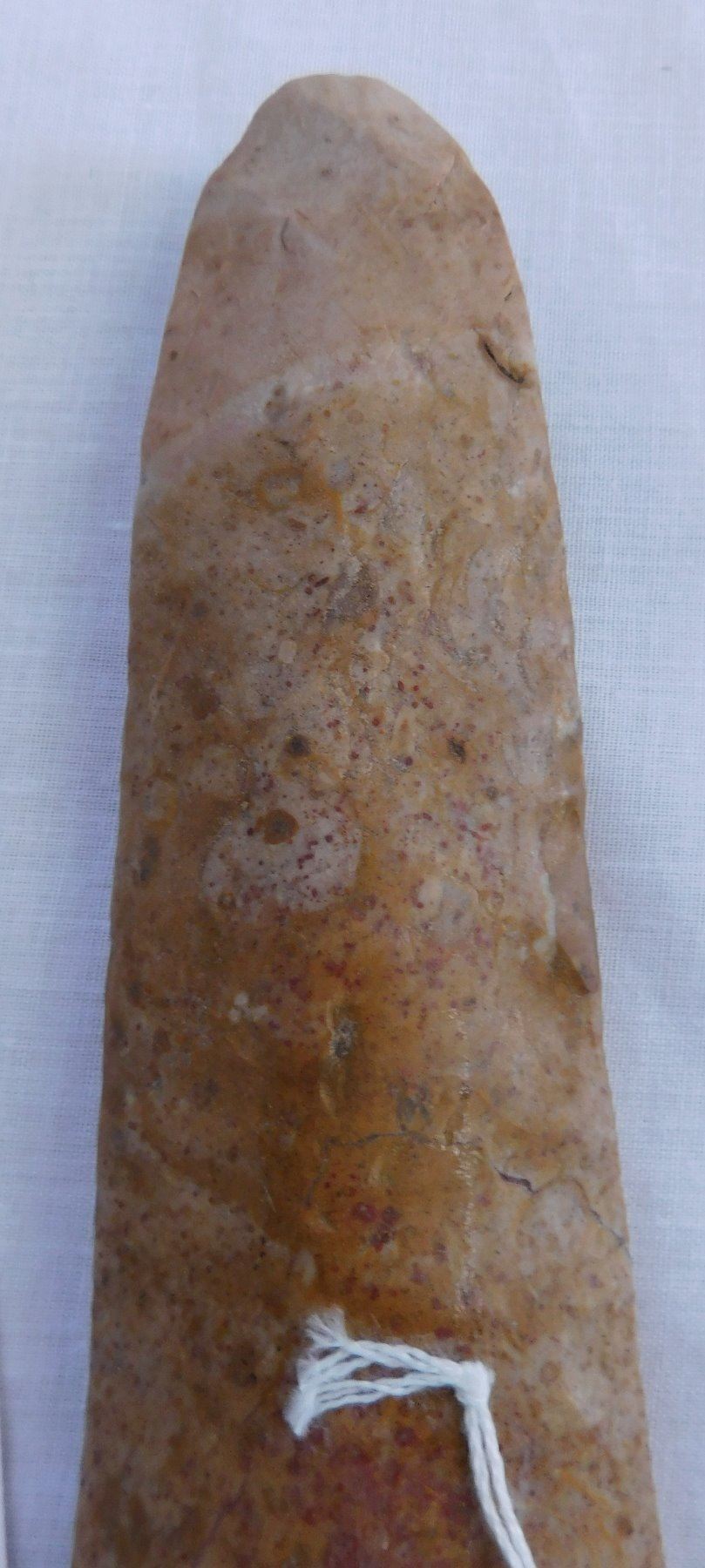 Spud Stone, pre-historic item. Made of stone, the item measures 8 1/8" x 3 1/4". Frederickstown, Missouri. Condition: As found, see images. Shipping: $25.50 w/insurance and signature, due to value.