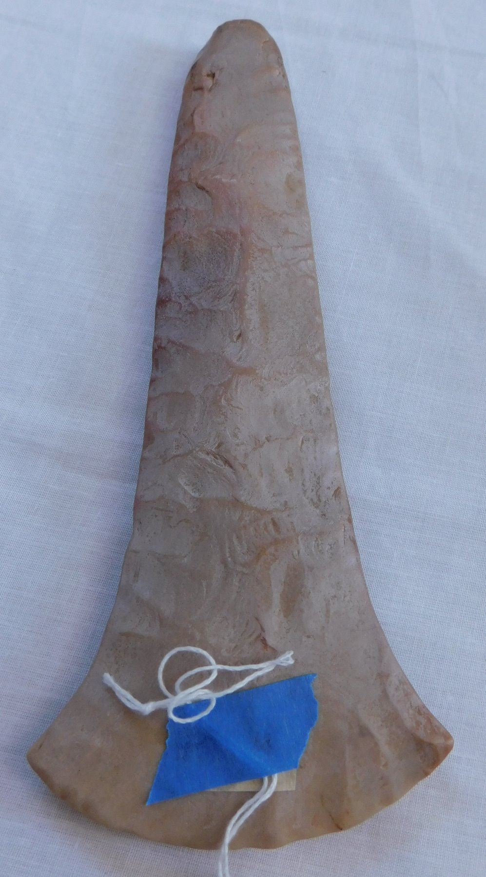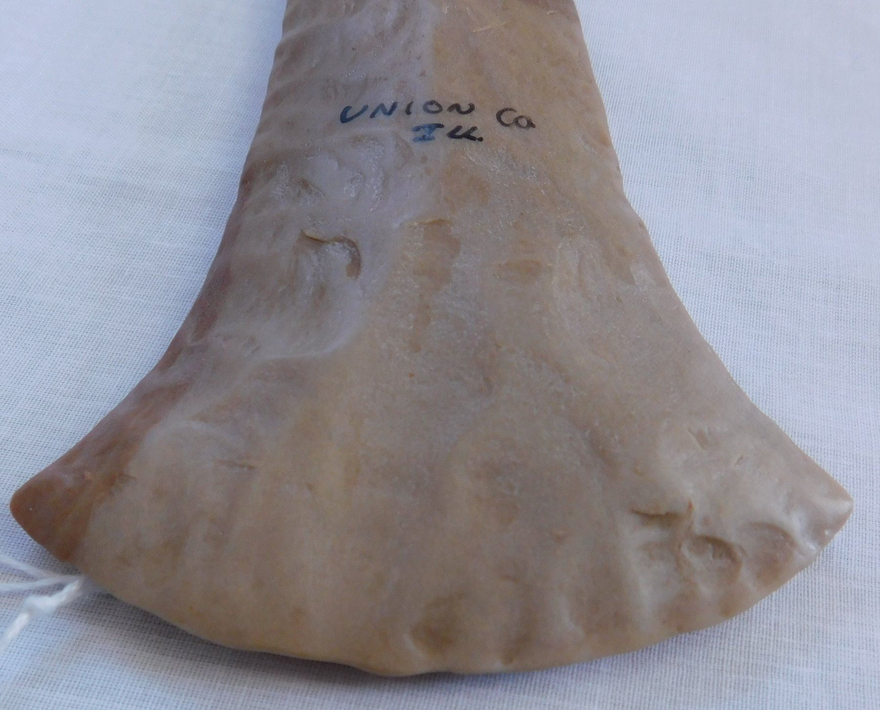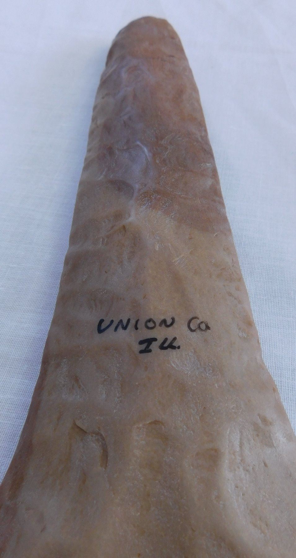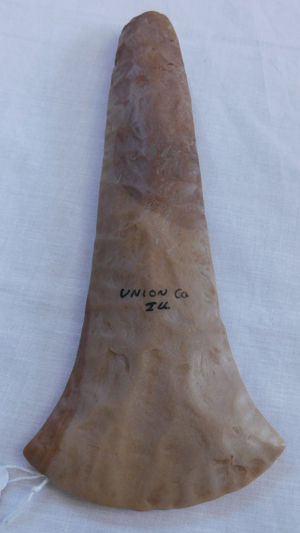Spud Stone, pre-historic item. Made of flint, the spud measures 10 1/" x 3 7/8". Union County, Illinois. Condition: Good, see images. Shipping: $26.50 w/insurance and signature, due to value.