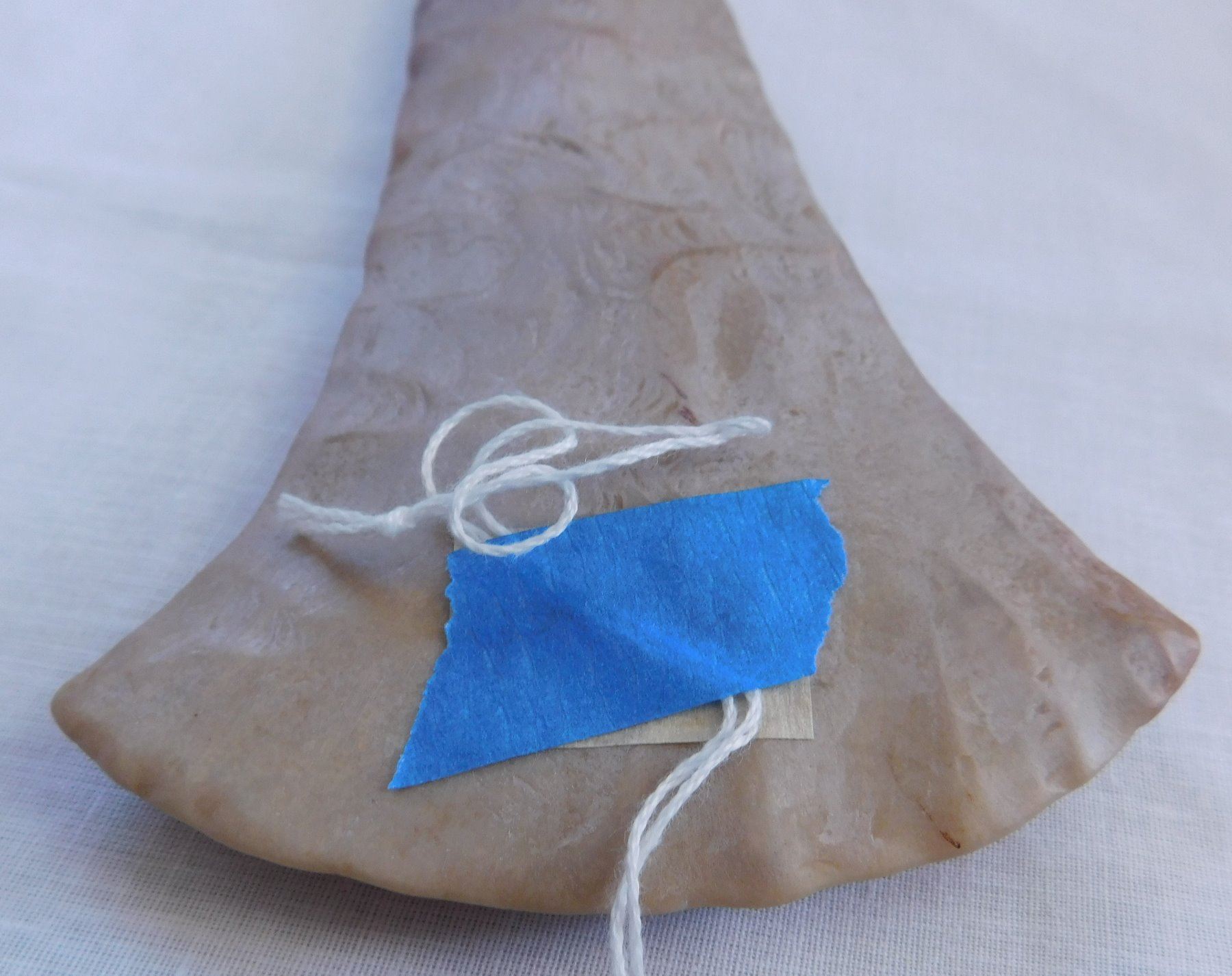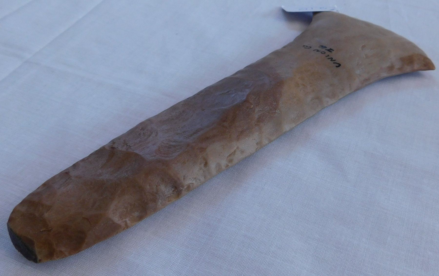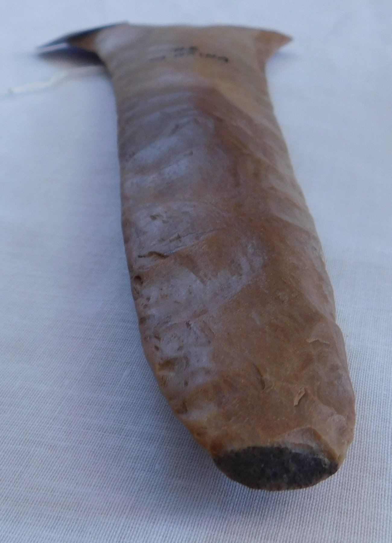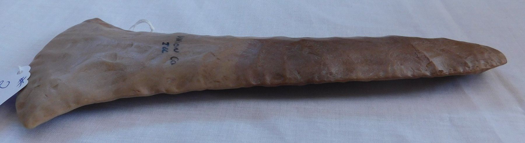 Spud Stone, pre-historic item. Made of flint, the spud measures 10 1/" x 3 7/8". Union County, Illinois. Condition: Good, see images. Shipping: $26.50 w/insurance and signature, due to value.