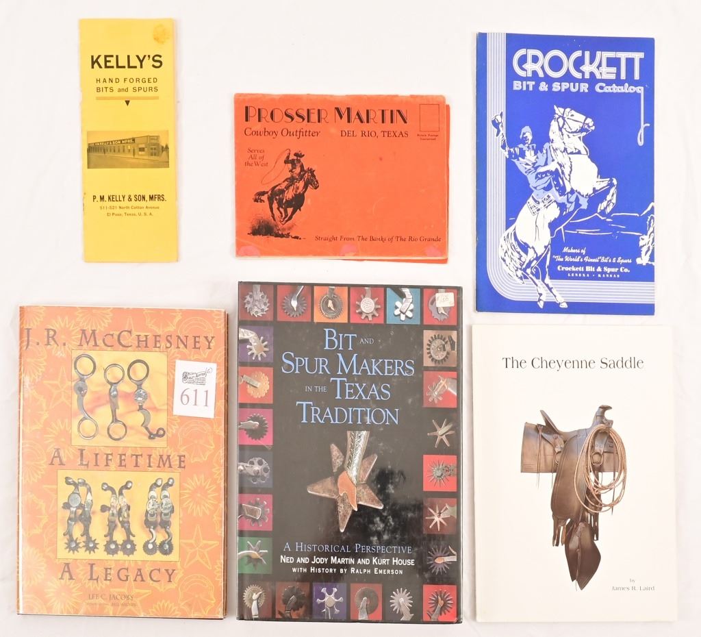 "J.R. McChesney, A Lifetime, A Legacy". Lee C .Jacobs. "The Cheyenne Saddle" with Photos, by James R. Laird. "Crockett Bit & Spur Catalog" No #14. Lenexa, Kansas. "Prossier Martin, Cowboy Outfitter", Del Rio, Texas."Kelly's Hand Forged Bits & Spurs" w/letter from Kelly & Sons. "Bit Spur Makers in The Texas Tradition" History by Ralph Emerson (New ,never opened).