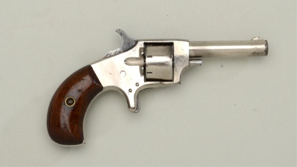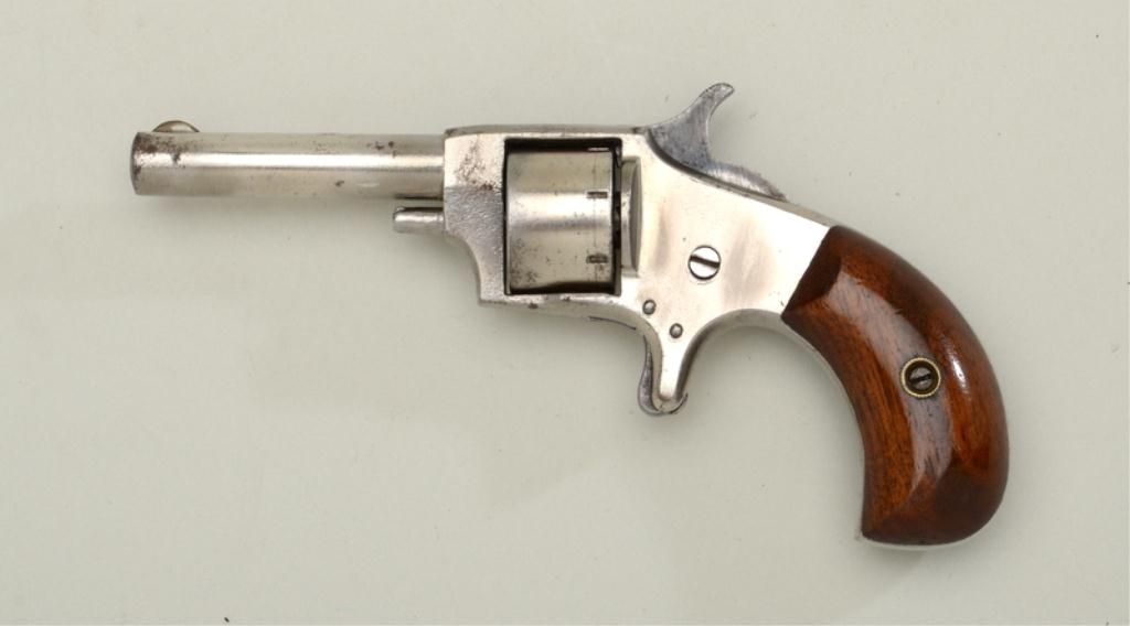 Spur trigger revolver marked “LEADER” on top strap, .22 cal., 2-1/2” round barrel, wood grips, #433. This gun is in overall fair condition showing a cleaned metal surface, dark bore, action needs work, very goodgrips. Est.: $50-$100.