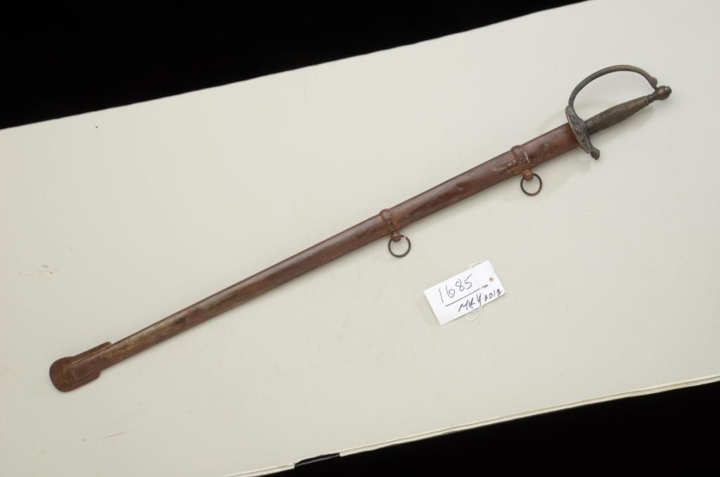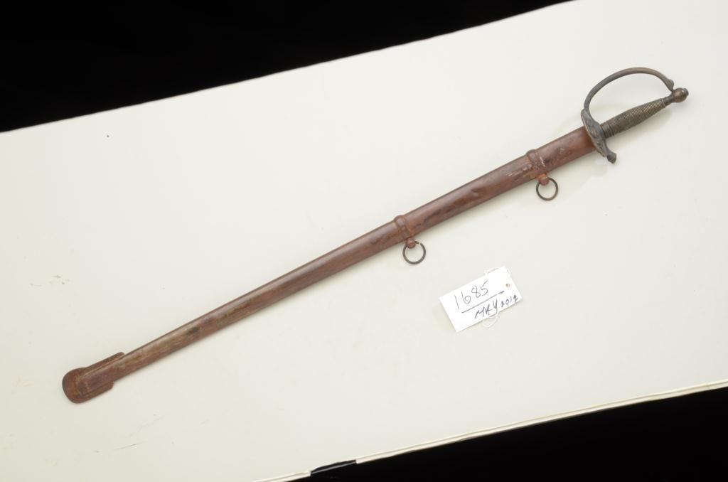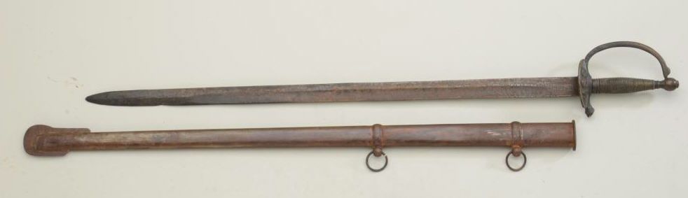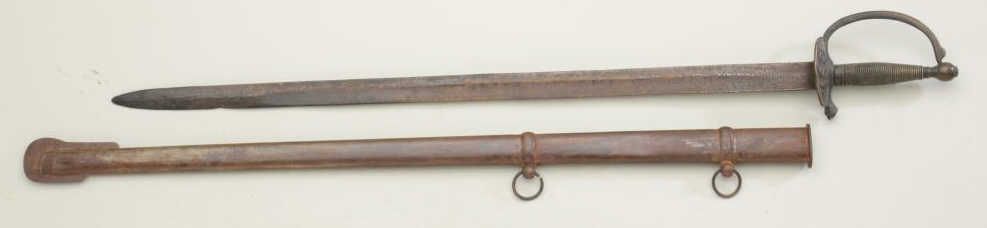 Spurious McElroy Confederate saber with cast bronze hilt showing CSA, fully etched blade, artificially aged with scabbard. The style of which made in England, 1960s and '70s, and sold by infamous dealers. Good forre-enactment or a wall hanger. Est.: $300-$600
