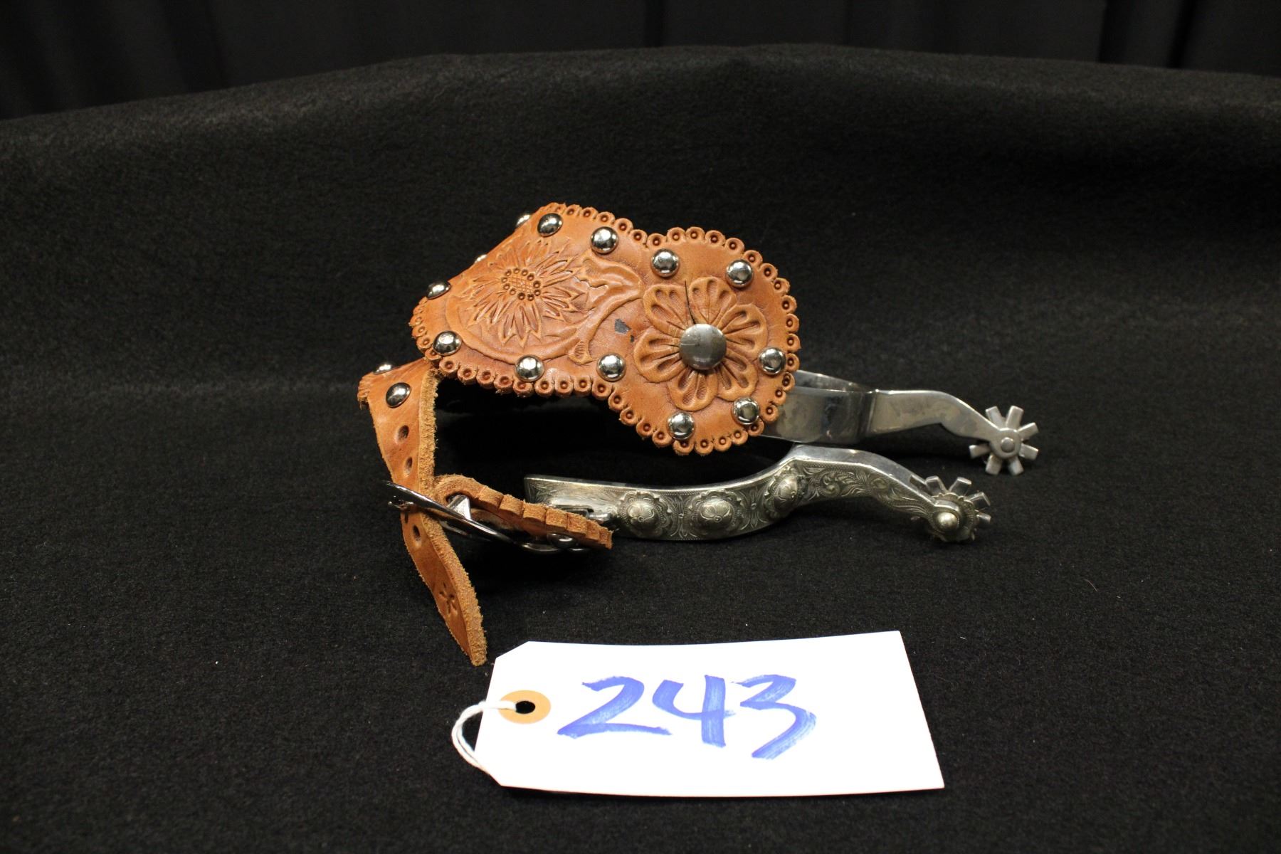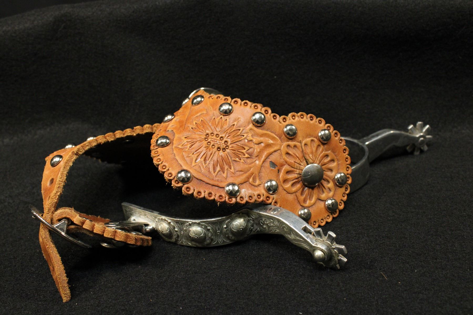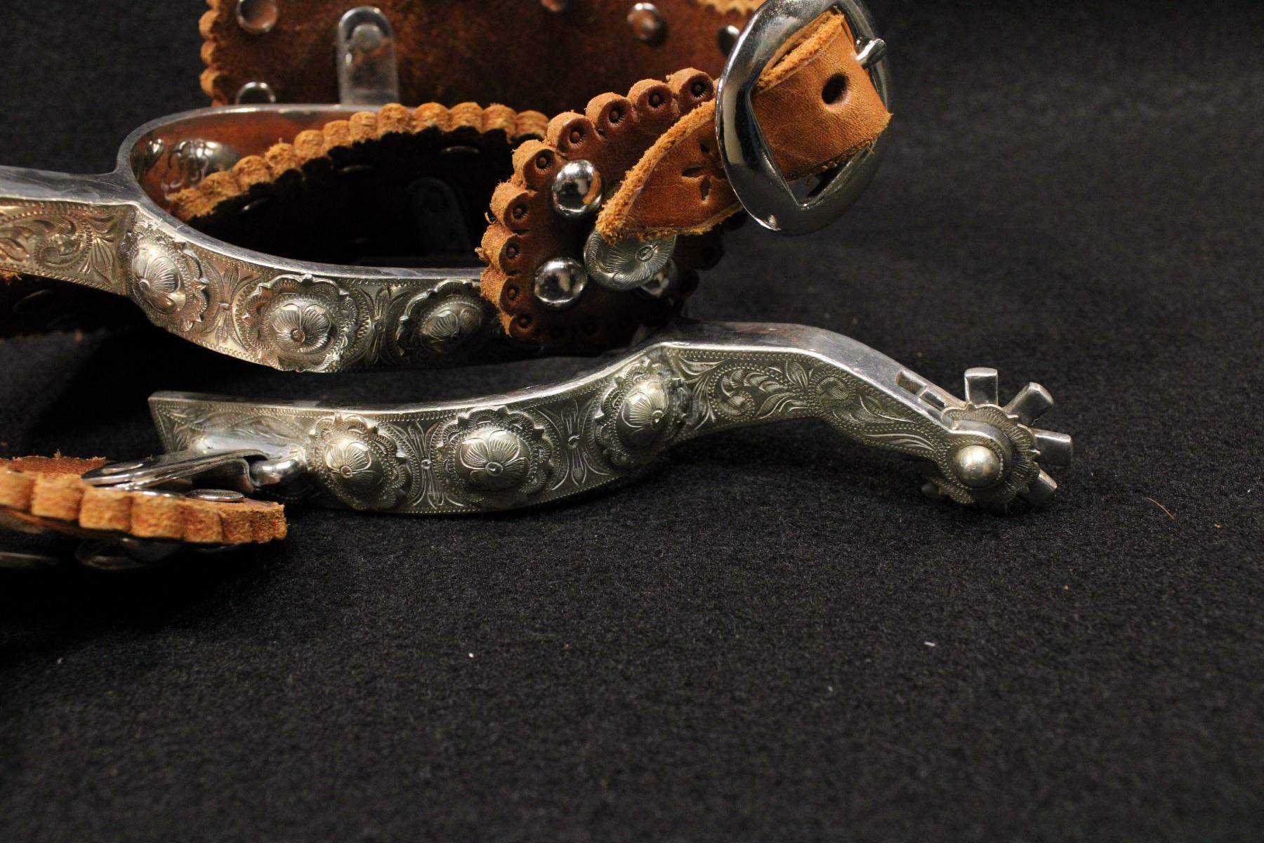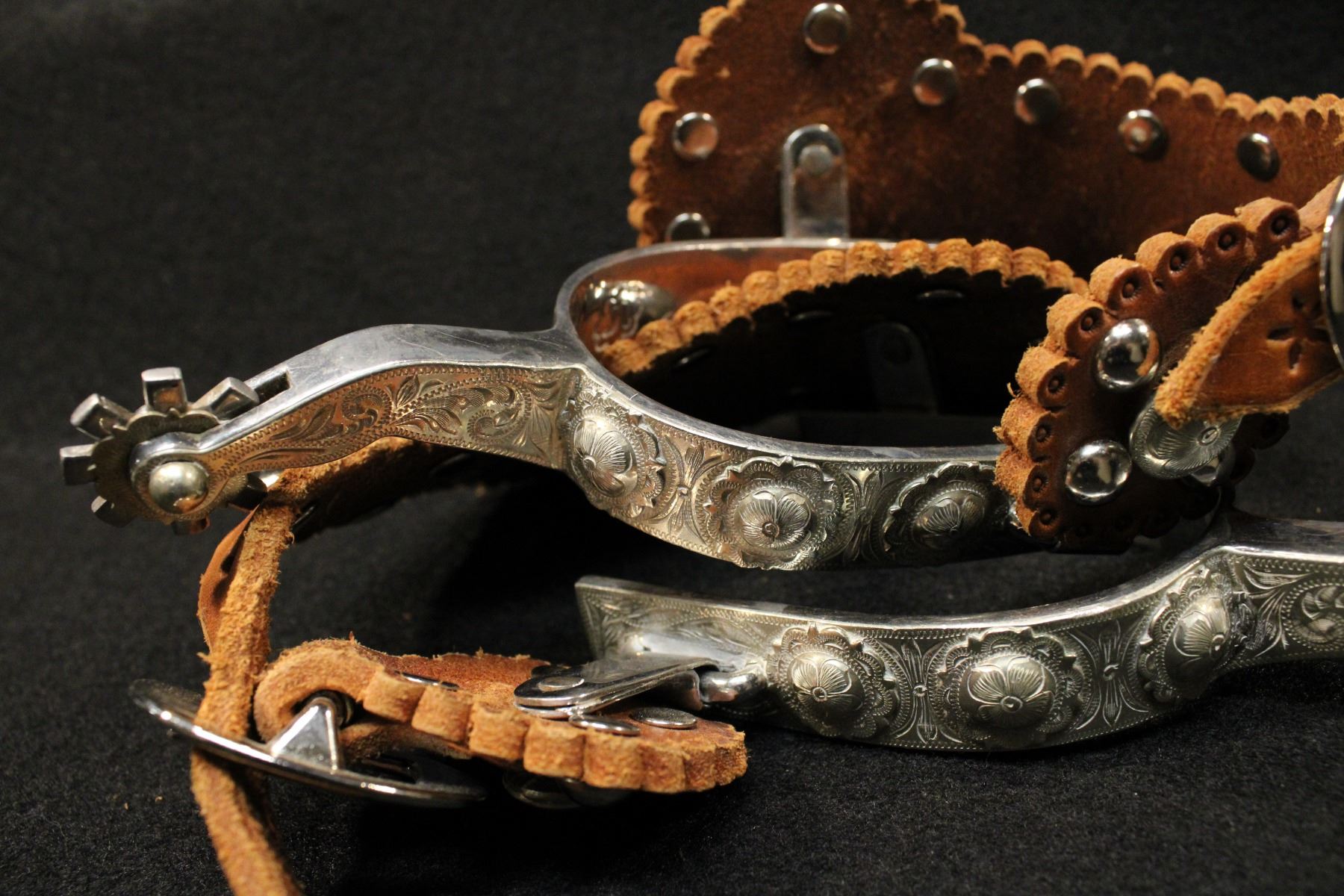 Spurs marked JR iron with silver inlay and shamrock rowels