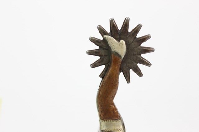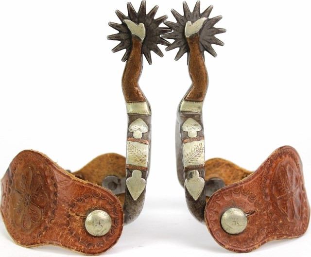 single mounted lady legs having belonged to Richard's himself. Unmarked McChesney No. 8, these unmarked spurs were bought by Jack from Dave Shelley Saddlery. Spurs include 2 piece leather straps also unmarked with the letter "R" stamped on each strap. Spurs show fine uncleaned condition with no repairs. Inside heel bands with small etched identification numbers.