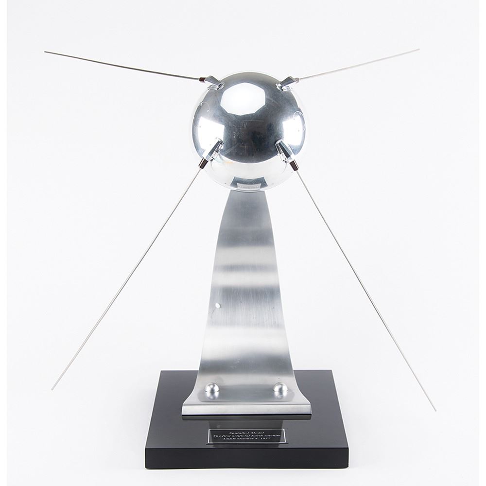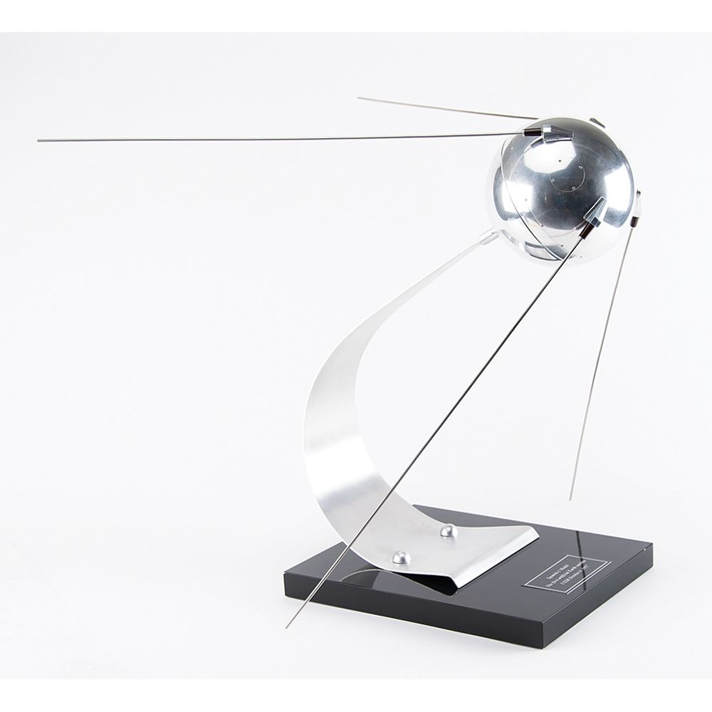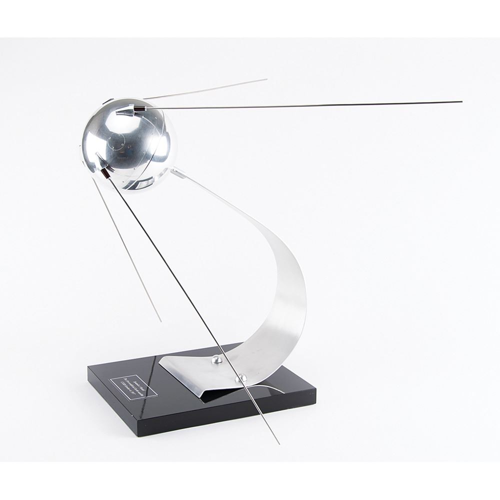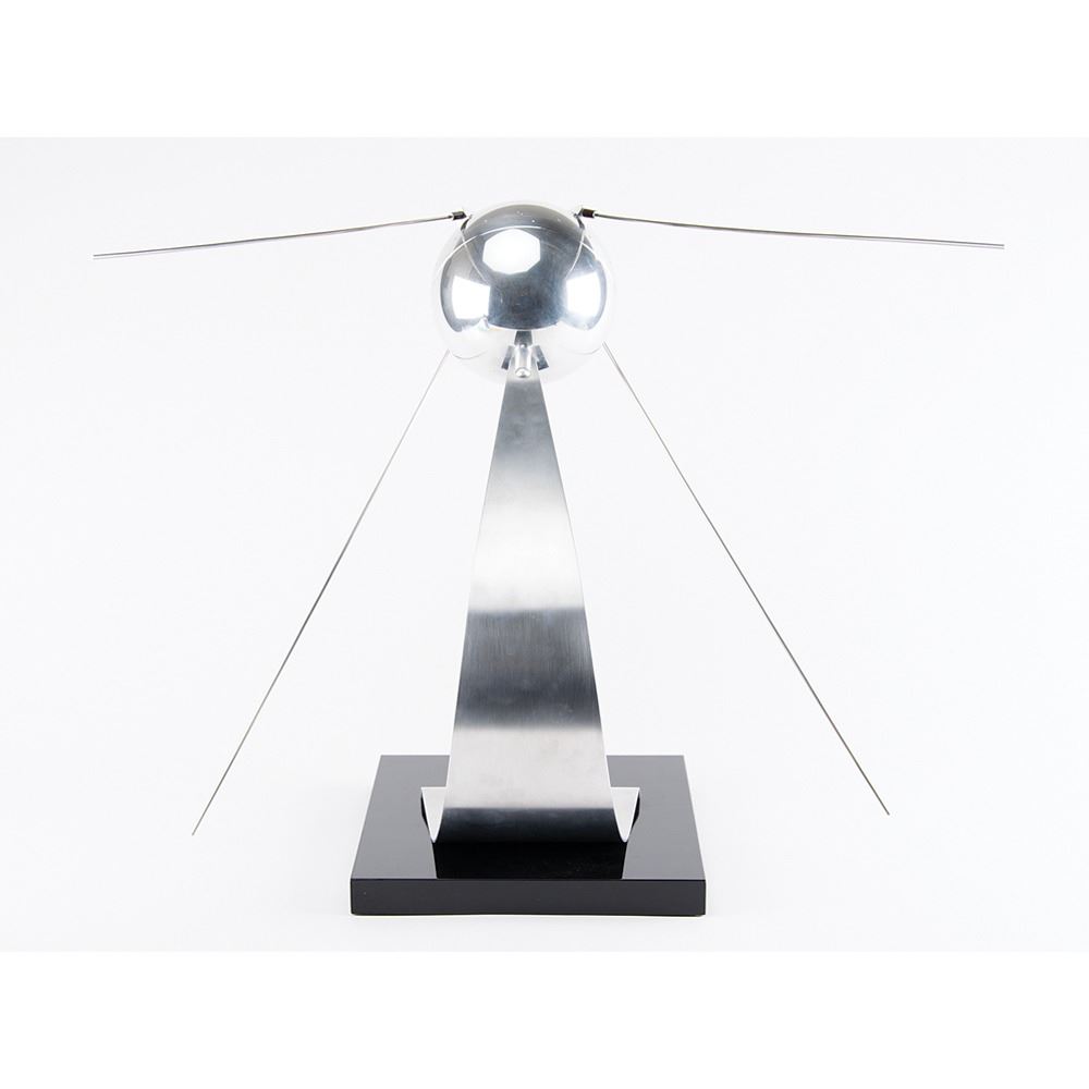 Wonderful 1:4 scale model of the important Soviet Sputnik-1 satellite on a handsome curved aluminum stand, measuring approximately 19.5˝ tall, with a plaque on the black lacquer 9.75˝ x 11.75˝ base reading, “Sputnik-1 Model, The first artificial Earth satellite, USSR October, 4, 1957.” The body of the model is constructed of polished aluminum with four 18.25˝ long polished steel antennas. The model precisely portrays the antennas and brackets, hatches, and head mounting screws. In fine condition. A handsome piece representing the birth of the ‘Space Race.’
