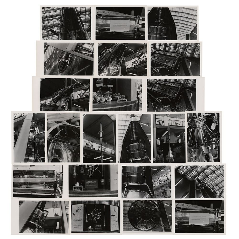 Collection of 24 original glossy photos, 7.25 x 5 and 8 x 5, picturing the Sputnik 3 satellite as part of a USSR exhibit at Expo 58, the 1958 Brussels World's Fair, which was held between April 17 and October 19, 1958. The Soviet pavilion, which was awarded with a Grand Prix award for its full exhibit, contained a facsimile of the Sputnik 3, a mockup that mysteriously disappeared and which the USSR accused the USA of stealing. In overall fine condition.