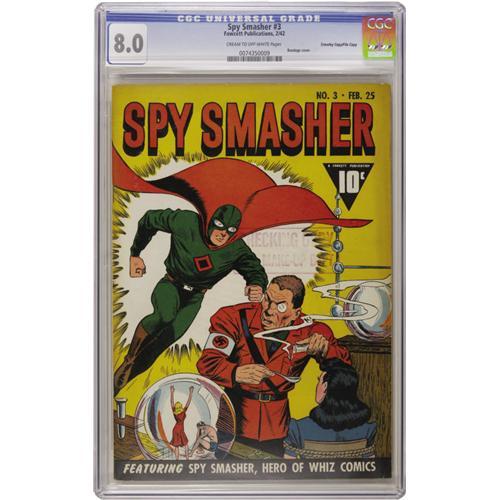 <B>Spy Smasher #3 Crowley Copy/File Copy (Fawcett, 1942) CGC VF 8.0 Cream to off-white pages.</B></I> This Crowley File Copy features a bondage cover and Tom McNamara art. Spy Smasher appears, for the first time, in his now familiar green costume. A Checking Copy stamp also appears on the cover. Overstreet 2006 VF 8.0 value = $719. CGC census 10/06: 2 in 8.0, 1 higher.<BR><BR><b>Shipping:</b> Slabbed Comic (<a target="_blank" href="http://www.heritageauctions.com/common/shipping.php">view shipping information</a>)