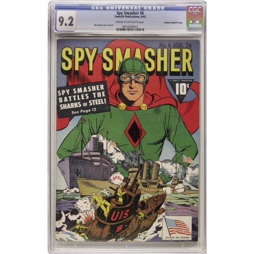 <B>Spy Smasher #6 Crowley Copy/File Copy (Fawcett, 1942) CGC NM- 9.2 Cream to off-white pages.</B></I> Presented here is another nice Fawcett book with a World War II cover by Mac Raboy. This is the highest graded copy certified by CGC to date. The cover bears a very faint "checking copy" stamp. Overstreet 2006 NM- 9.2 value = $1,350. CGC census 10/06: 1 in 9.2, none higher.<BR><BR><b>Shipping:</b> Slabbed Comic (<a target="_blank" href="http://www.heritageauctions.com/common/shipping.php">view shipping information</a>)