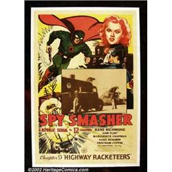 Spy Smasher - Chapter 9 "Highway Racketeers"(Republic 1942) One Sheet ( 27" X 41"). Republic Pictures was the serial studio from the late thirties up through the forties. They produced the most action and cliff hanging chills of any studio in their day. Offered here is a sheet from the WWII propaganda serial "Spay Smasher"! Notice the artwork of our hero running to crush the masked Nazi radio operator. Fine on Linen. Important notice: We expect to be auctioning lots at the rate of 200-250 per hour. Sometimes eBay Premier live bid software cannot keep up with that pace, so we strongly recommend that you place a realistic proxy bid now as insurance to avoid disappointment. Also please note that all Heritage/CAA lots purchased through eBay Premier carry a 20% Buyer's Premium.