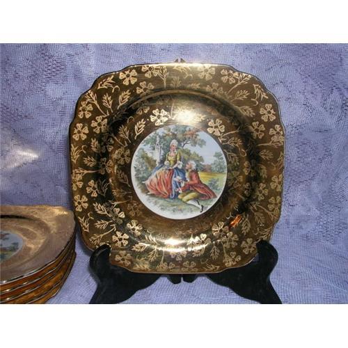 This is a beautiful set of 6 square cake plates decorated with warranted 22 karat gold. They have a romantic couple in the center dressed in 1700s style clothing. The wide gold band has flowered embossed throughout. They are in unused condition but do have some wear to the gold on the edges from being displayed. There also is crazing but no chips, nicks or fractures. They measure 6-3/4" square. These would make a lovely wedding or anniversary present. The price is for all six plates.