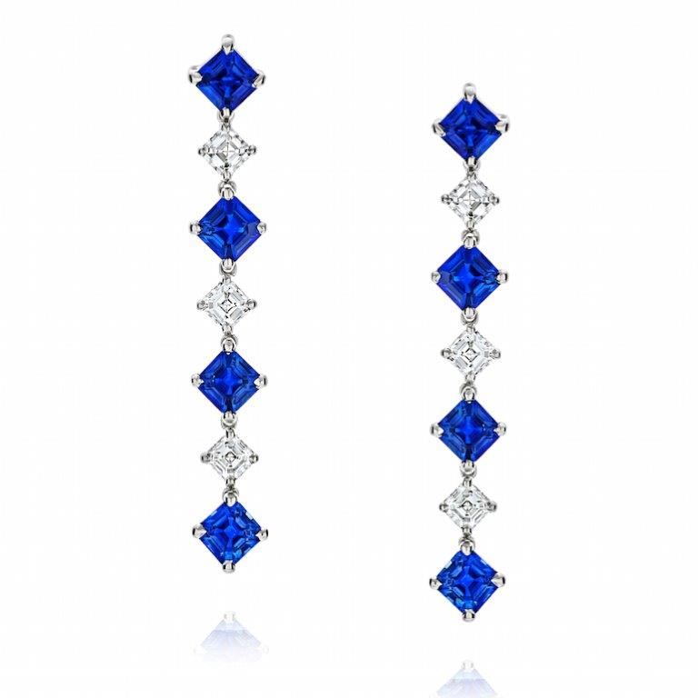 Blue Sapphire and Diamond Asscher Cut Earrings, with a total Sapphire weight of 3.05ct and total diamond weight of 0.90ctw set on platinum screw backs.