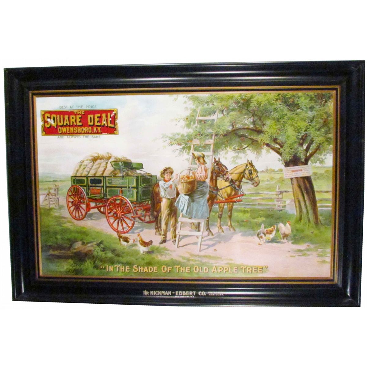 Square Deal Wagon Company Self Framed Tin Sign. Entitled, "In the Shade of the Old Apple Tree". A few minor rubs otherwise excellent condition. The Hickman-Ebbert Co. Owensboro, KY. 37 1/2 X 25 1/2 inches.