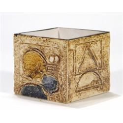 Square Troika pot incised and painted with an abstract pattern, marked Troika Cornwall England to base, 9cm high