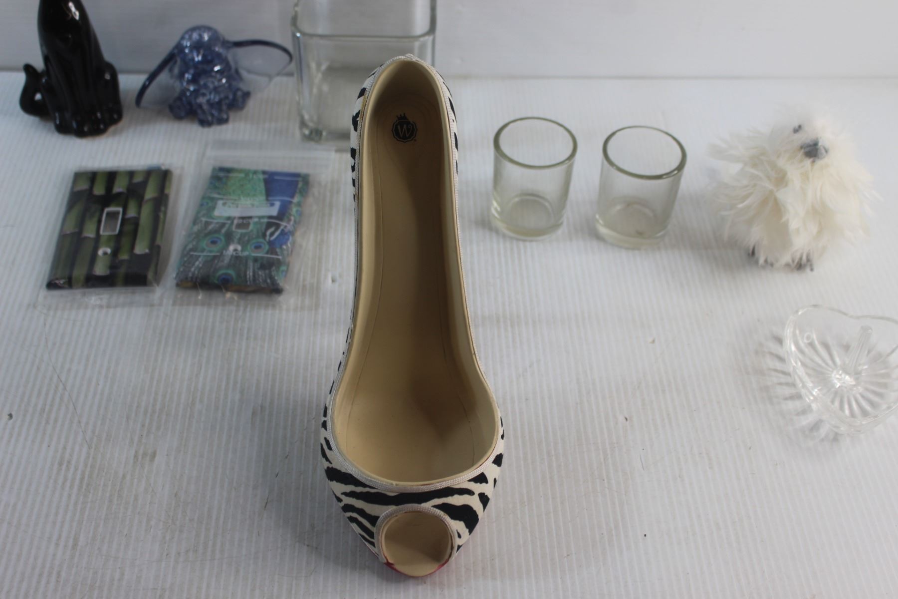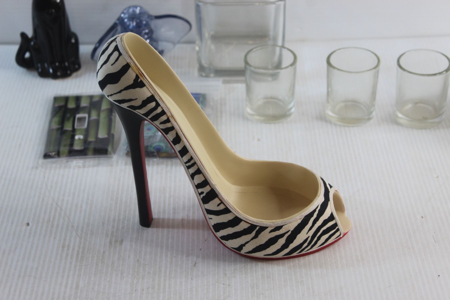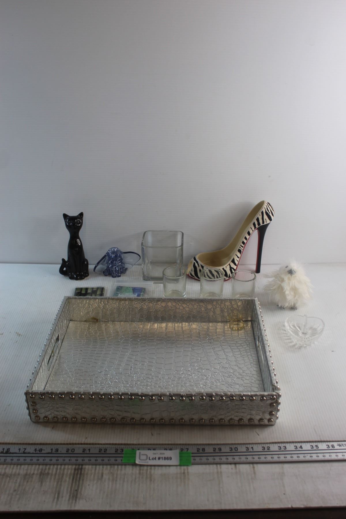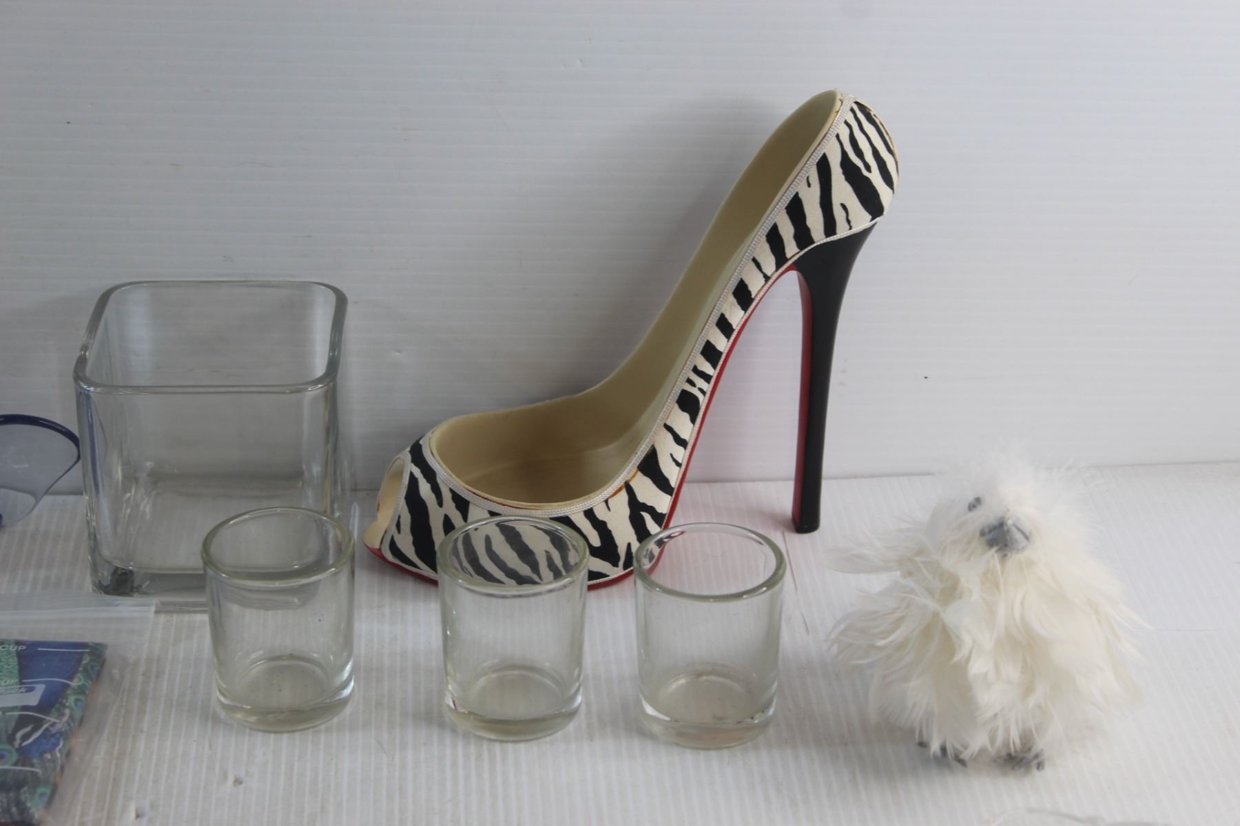 Square Vase, High Heel Wine Bottle Holder, (3) Glass Shots and Assorted Items