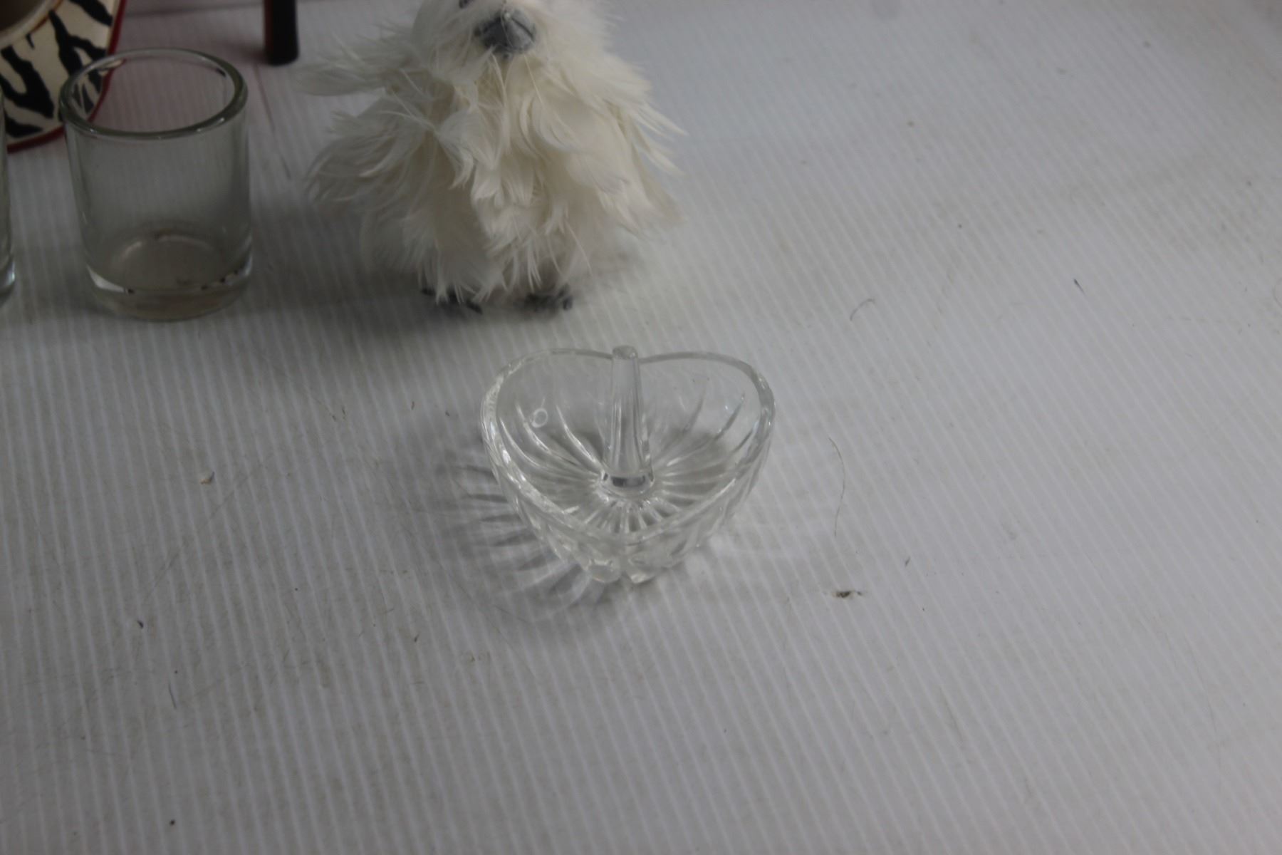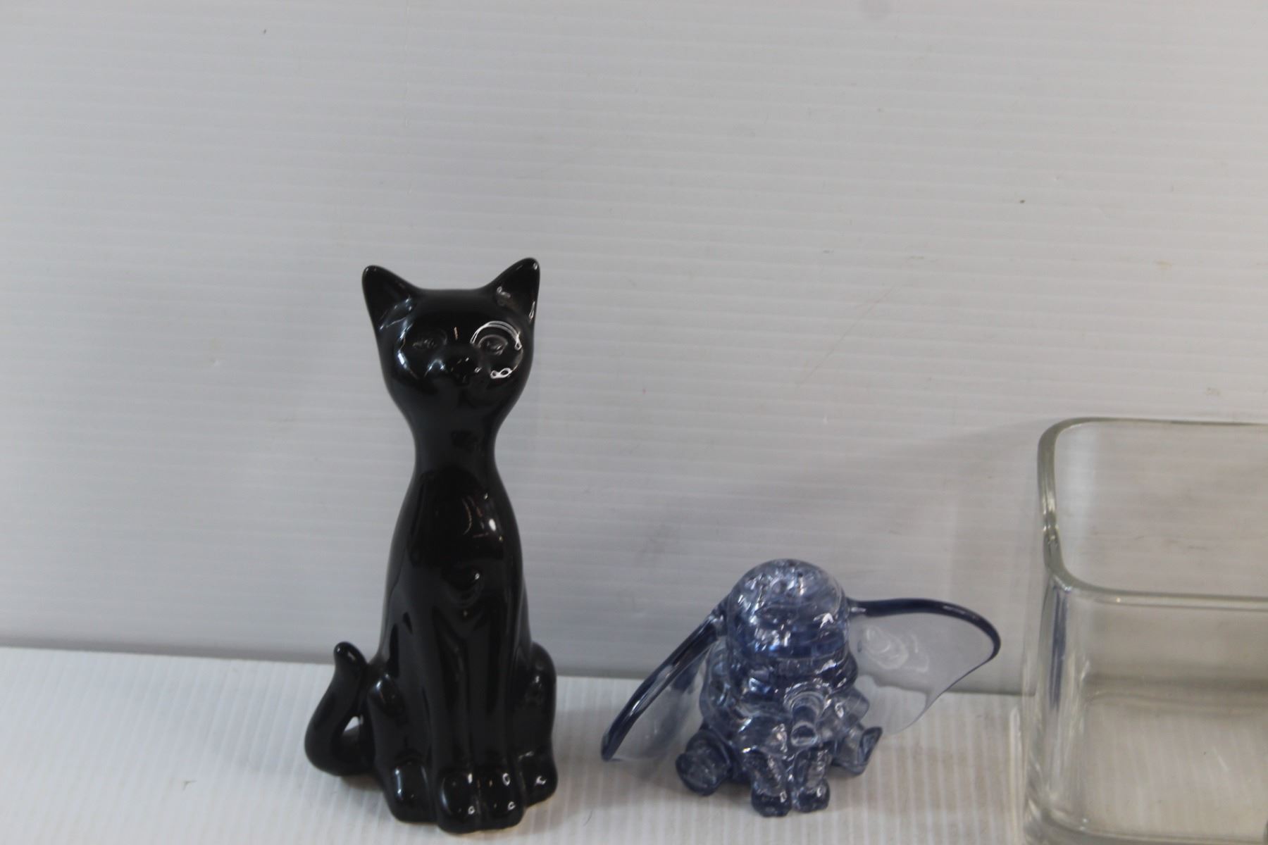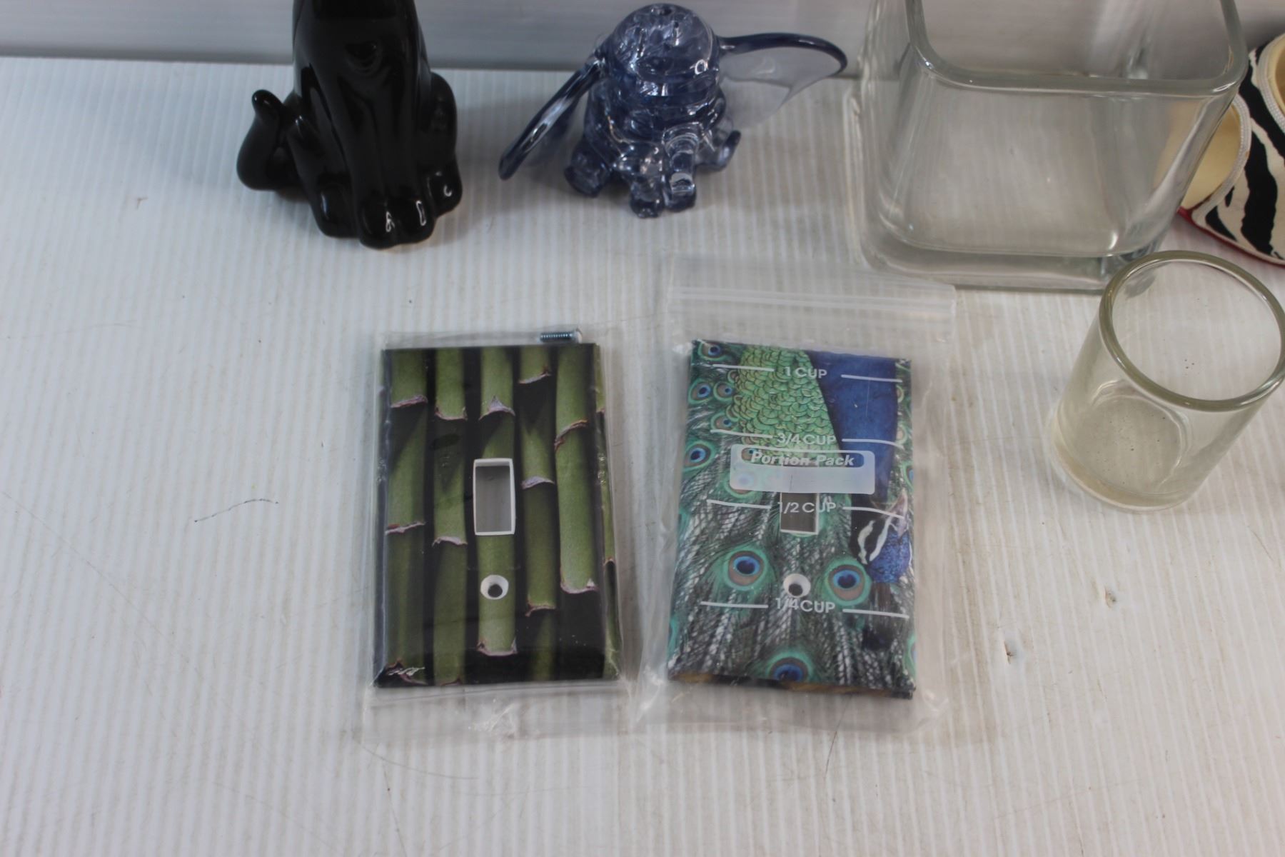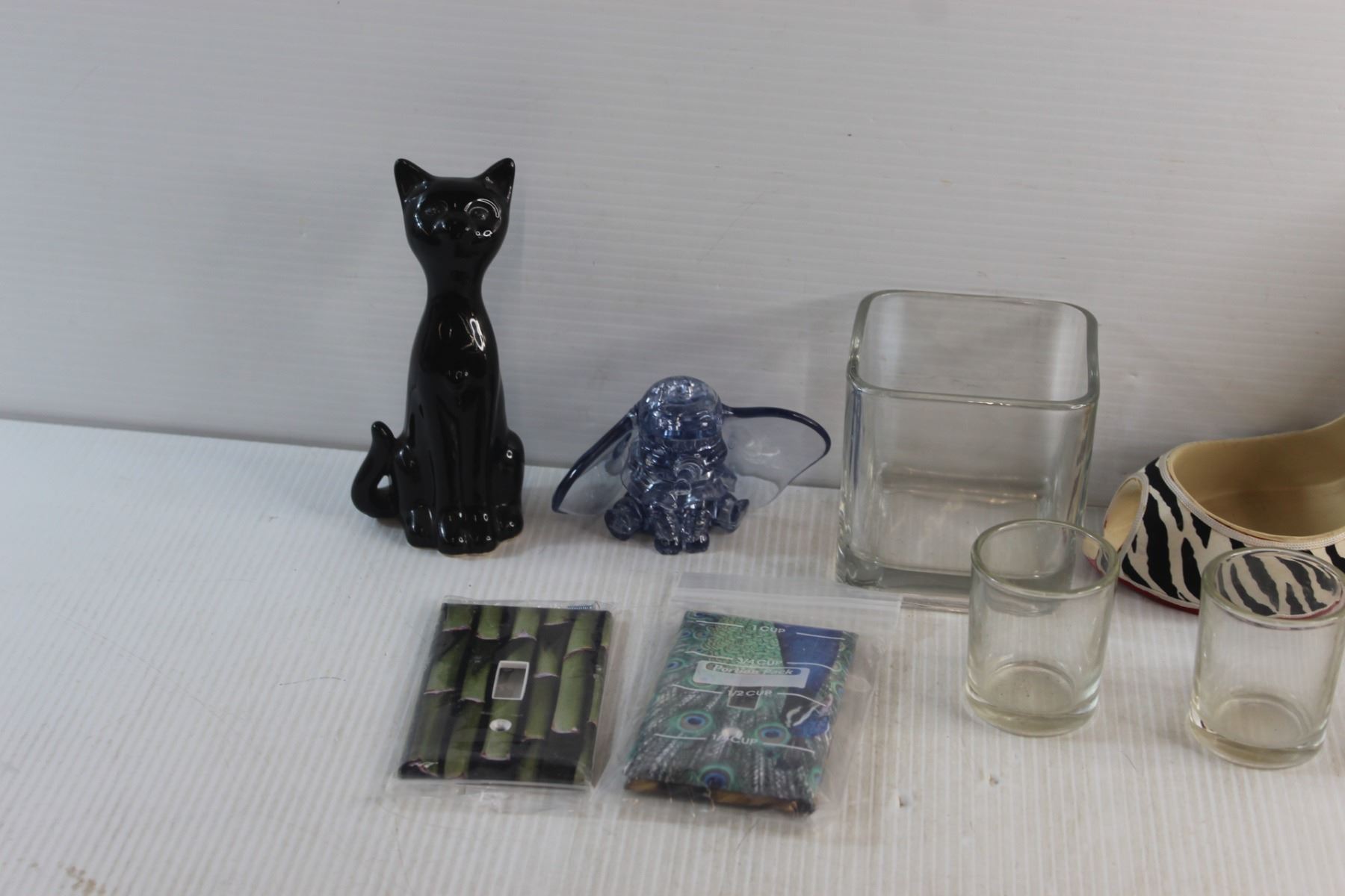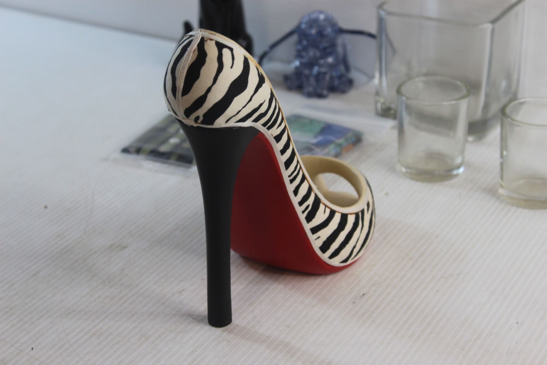 Square Vase, High Heel Wine Bottle Holder, (3) Glass Shots and Assorted Items