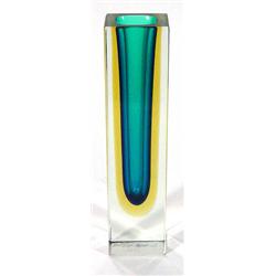 Square based Murano cut glass vase with turquoise and amber colouring, 21cm high