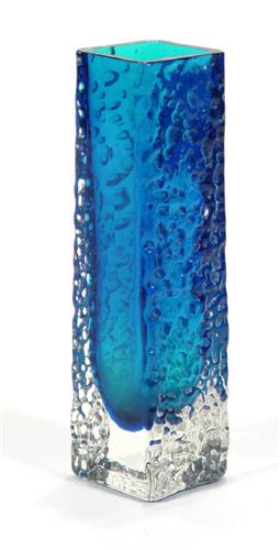 Square based Whitefriars style blue glass vase with bark design panels, 17cm high
