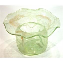 Square based green glass vase with frilled neck and gold flecking, 8cm high