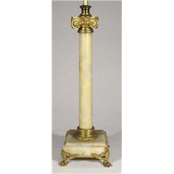 Square based marble and ormolu Ionian column table lamp on claw feet, 60cm high