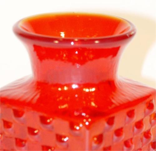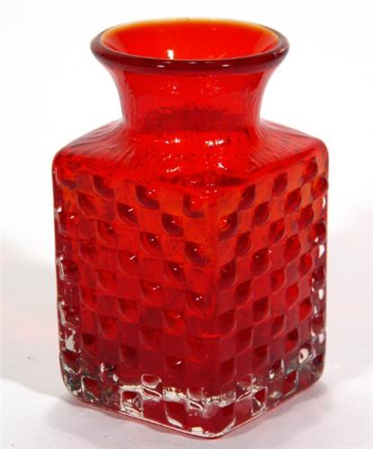 Square based red Whitefriars glass vase with raised geometric design, 14cm high