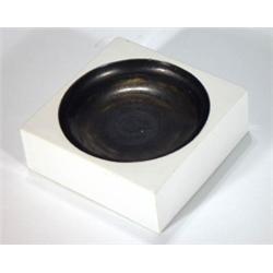 Square black and white glazed Troika ashtray 'The Hills' painted Troika England SK to base, 12cm long